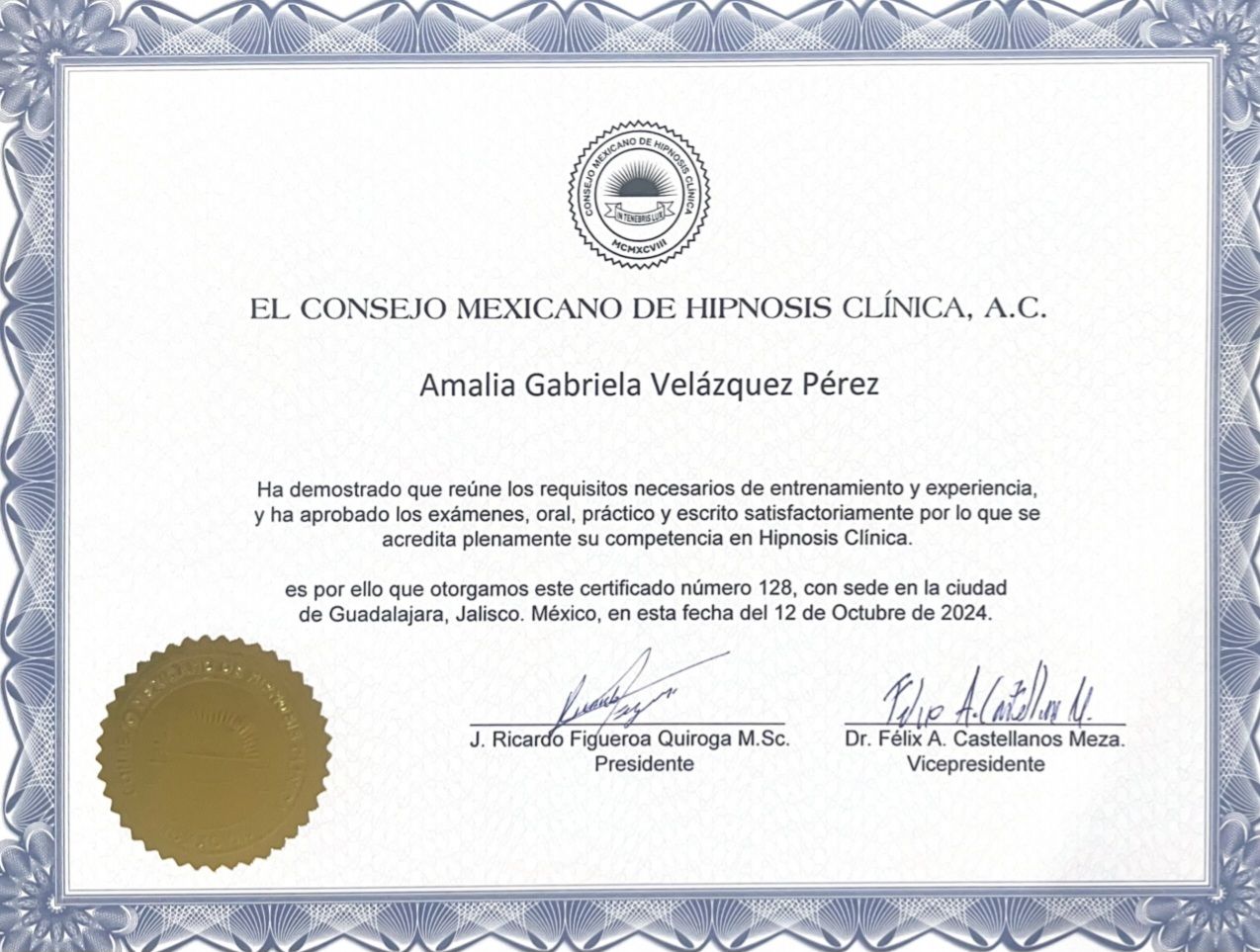 Certificación en Hipnosis Clínica: Hipnosis y Depresión, Hipnosis y Sexualidad(Disfunciones sexuales, Eyaculación precoz, Eyaculación retrazada, aversión al sexo, vaginismo), Hipnosis regresiva para el tratamiento del trauma, Intervenciones en Psicoterapia de pareja, Hipnosis y eventos traumáticos en la infancia, Hipnosis en el deporte.