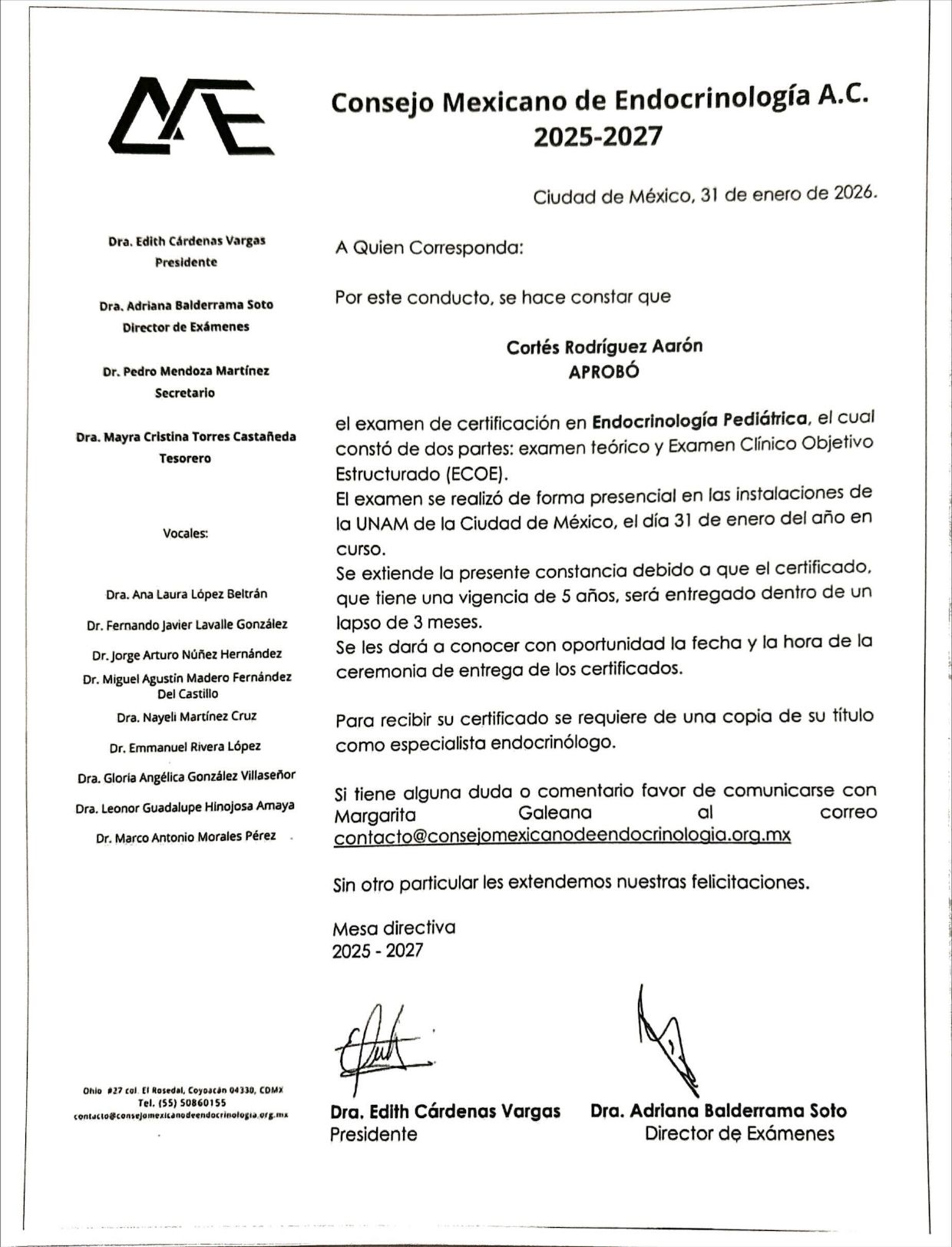 Soy el Dr. Aarón Cortés Rodríguez, Endocrinólogo Pediatra certificado (CME 1590). Sé que la salud de tus hijos es lo más importante. Si tienes dudas sobre su crecimiento, peso, tiroides, diabetes o desarrollo en la pubertad, estoy aquí para apoyarte. En mi consulta me tomo el tiempo de platicar con ustedes, resolver todas sus dudas y asegurarme de que tu pequeño reciba el mejor tratamiento en un ambiente de total confianza.