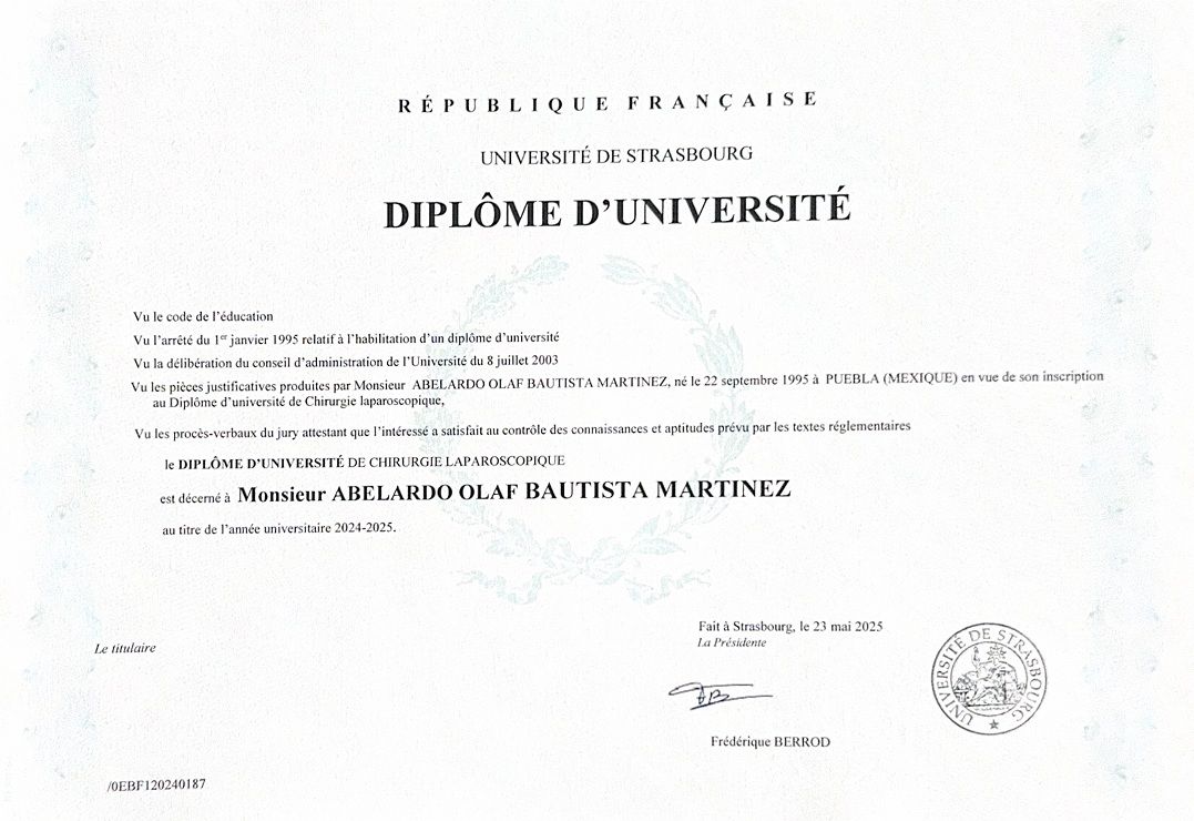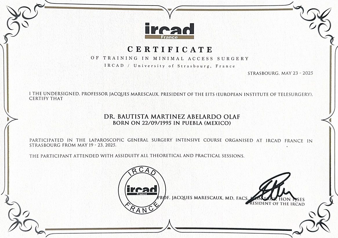 Soy cirujano general, egresado de la UMAE Hospital de Especialidades No. 25 del Centro Médico Nacional del Noreste, con formación avalada por la Universidad de Monterrey. Estoy certificado por el Consejo Mexicano de Cirugía General y complementé mi preparación en cirugía de mínima invasión al participar en el Curso Intensivo de Laparoscopía en Cirugía General en IRCAD Francia, en la ciudad de Estrasburgo.