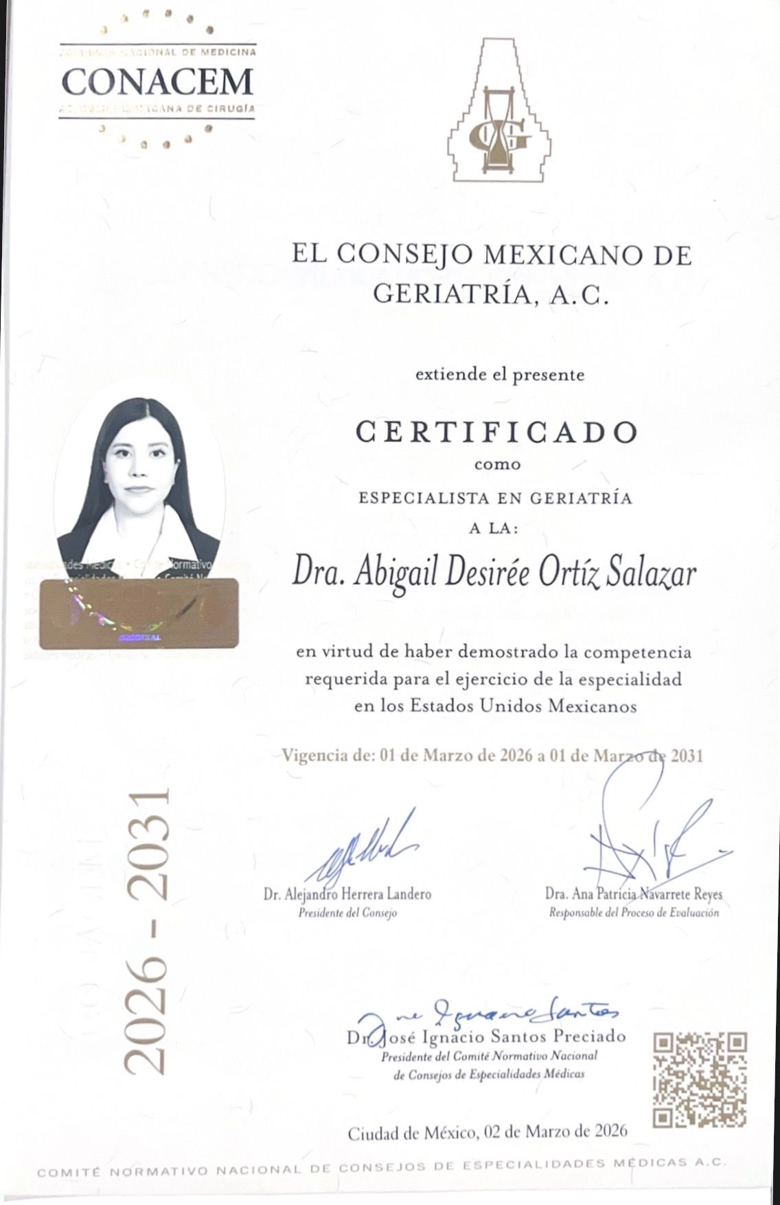 Mi objetivo es acompañar a cada paciente en su proceso de envejecimiento de manera digna, activa y saludable, brindando atención médica basada en la ética, la empatía y la actualización continua.