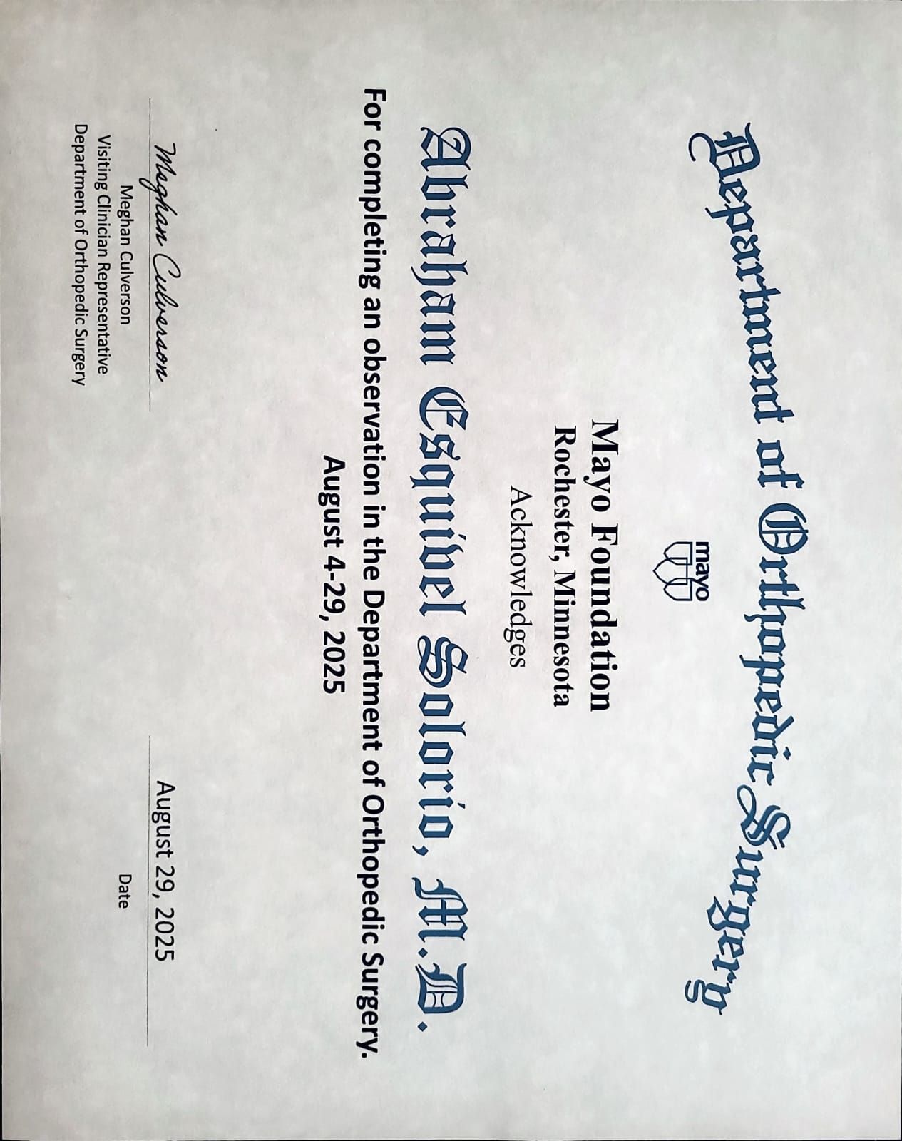 Agenda tu cita desde Doctoralia, marca al teléfono asignado o por Whatsapp para otros horarios. Urgencias 24/7. ¡Hola! Soy Abraham E. Solorio, soy Especialista en Traumatología y Ortopedia Certificado por el Consejo Mexicano de Ortopedia y miembro de la Arthroscopy Association of North America (USA), tuve la oportunidad de realizar un Posgrado de Alta Especialidad en Cirugía articular (lesiones deportivas, artroscopia, prótesis y reconstrucción) de Rodilla, Cadera y Hombro en el Hospital Ángeles, así como un Posgrado Internacional en Patología y Cirugía Avanzada de Rodilla y cirugía robótica Ortopédica por la Universidad Francisco de Vitoria de Madrid , España. En Hannover, Alemania continué entrenándome en Cirugía de alta especialidad de mínima invasión y prótesis complejas de Hombro, rodilla y cadera. Realicé un travelling Fellowship en el mejor Hospital del Mundo, la MAYO CLINIC en Rochester, USA entrenándome en cirugía Compleja de hombro, rodilla y cadera. En Harvard University realicé me certifiqué en técnicas de uso de Células Madre en Medicina regenerativa. En Barcelona, realicé en el Hospital Universitari Dexeus un nuevo enfoque en cirugías de artroscopia y prótesis de Hombro, rodilla, cadera, tobillo y muñeca. Realicé un fellowship en Hospital CEMTRO de Madrid de cirugía de Cadera compleja, prótesis, artroscopia y Cirugía robótica así como enfoque en cirugía deportiva y lesiones del deporte (Centro Médico de Excelencia FIFA) En Nova Scotia , Canadá hice una estancia para continuar mi entrenamiento en lesiones deportivas tratadas por mínima invasión (cirugía artroscópica). Realicé un curso en lesiones deportivas por la FIFA. En el Hospital Santa Cristina de Madrid realicé formación en cirugías complejas de rodilla y cadera. Trato a mis pacientes que sufren lesiones en sus articulaciones y huesos por medio de cirugía de mínima invasión (artroscopia), prótesis o reconstrucción , uso de robot en cirugía ortopédica, soy experto en tratamiento del desgaste del cartílago, enfermedades de la rodilla, cadera, hombro, lesiones deportivas, fracturas de todo el esqueleto, lesiones en columna, mano, codo, pie y el tobillo, así como padecimientos relacionados a los músculos, tendones, ligamentos y articulaciones. La gran mayoría de mis pacientes no requieren cirugía y les otorgo el tratamiento más avanzado de manera internacional fuera del quirófano, de hecho siempre intento primero el tratamiento sin cirugía cuando la enfermedad lo permite. Permíteme ayudarte con mi experiencia y encontremos juntos, en un ambiente relajado y de confianza, el tratamiento más adecuado para tu enfermedad con el mejor trato cálido, amigable, digno, cordial y profesional que te mereces.