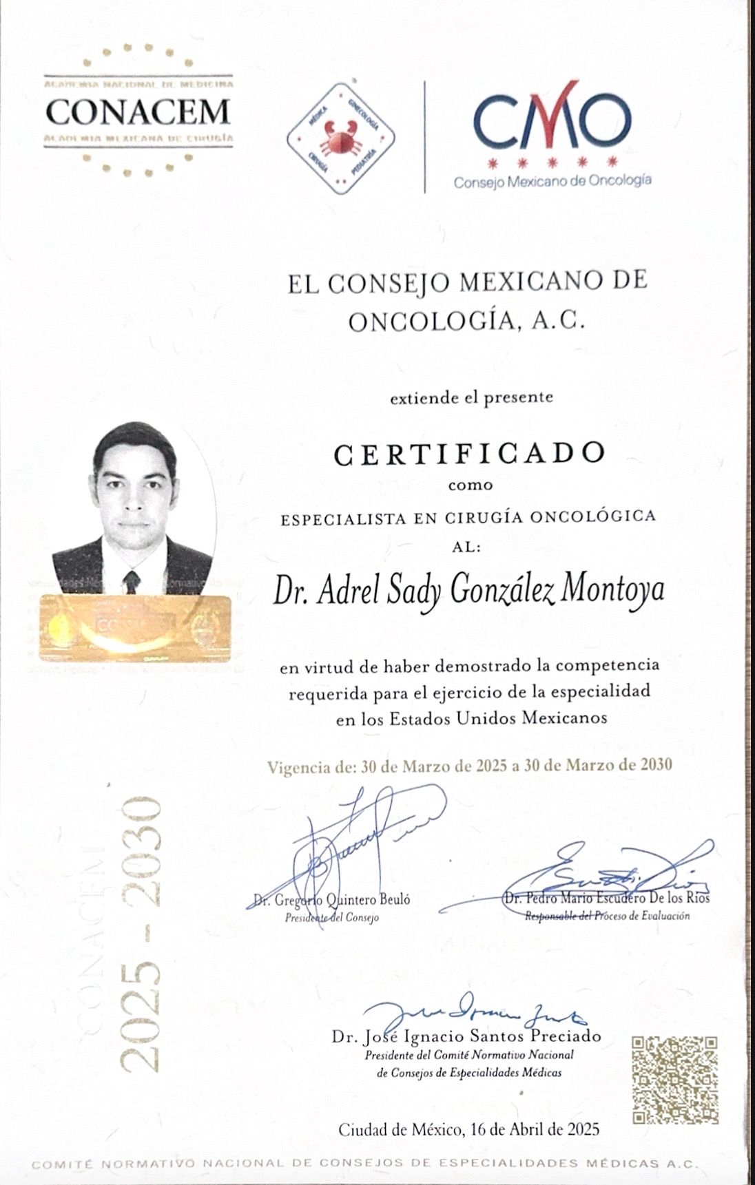 Soy Cirujano Oncólogo especialista en el tratamiento, diagnóstico, vigilancia y prevención del CÁNCER, tumores, nódulos y quistes de diversos órganos, egresado de la Universidad de Monterrey; y Cirujano General especialista en el tratamiento quirúrgico de diversos padecimientos Generales.