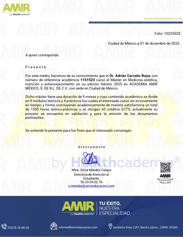 Médico Cirujano por la UPAEP, con formación sólida en atención integral de la salud y enfoque preventivo. Complementé mi preparación con un Máster en Medicina Estética y Antienvejecimiento por la UDIMA, lo que me permite ofrecer tratamientos modernos, seguros y personalizados para mejorar la armonía facial, corporal y el bienestar general de mis pacientes.