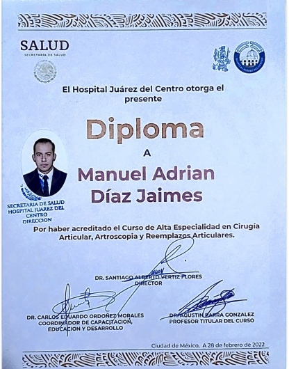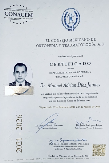 Profesional altamente capacitado, en constante actualización con amplia experiencia en la prevención, diagnóstico y tratamiento de lesiones del esqueleto; ha ayudado a innumerables pacientes a recuperarse de fracturas, lesiones deportivas y dolor crónico. Especialista certificado ante el Consejo Mexicano de Ortopedia y Traumatología A.C. (Registro: 16/5732/21), además de contar con Alta Especialidad en Cirugía Articular, Artroscopia y Reemplazo articular con aval universitario.