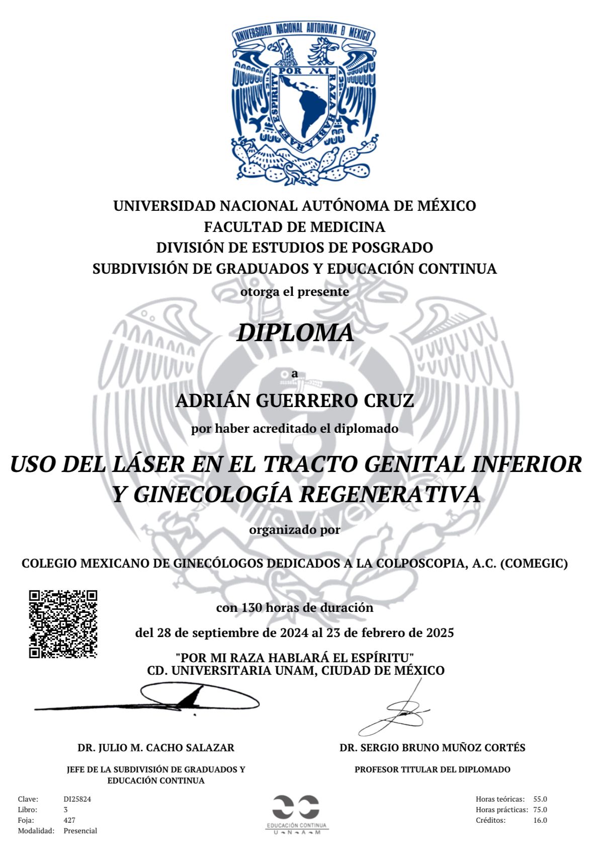 Tengo formación complementaria en colposcopía y patología de tracto genital inferior, diplomado en Láser y ginecología regenerativa avalados por la UNAM, diplomado en ultrasonido obstétrico y ginecológico avalado por la Universidad La Salle, así mismo cuento con certificación vigente ante el Consejo Mexicano de Ginecología y Obstetricia y soy miembro colegiado titular del Colegio Mexicano de Especialistas en Ginecología y Obstetricia A.C. (COMEGO).