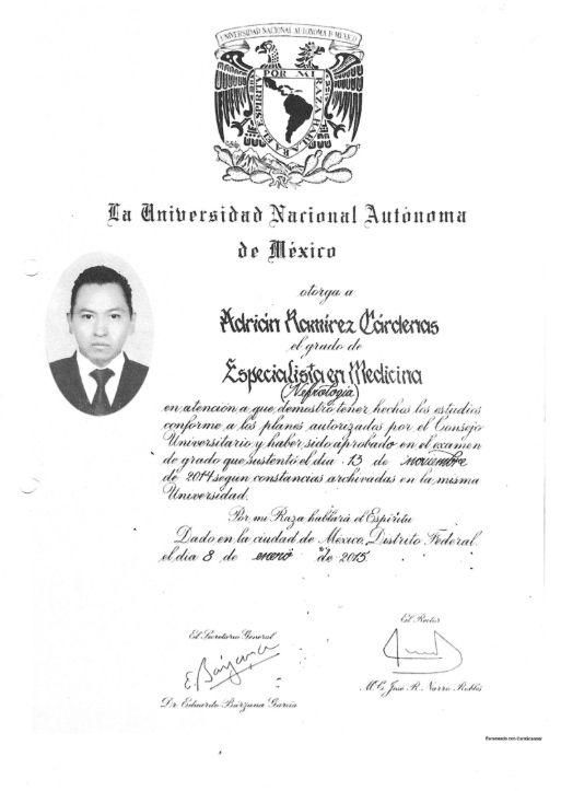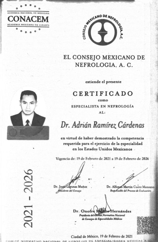 MEDICO NEFROLOGO, EGRESADO DE CENTRO MEDICO NACIONAL SIGLO XXI, CERTIFICADO POR EL CONSEJO MEXICANO DE NEFROLOGÍA, COMPROMETIDO CON LA ATENCION DE CALIDAD Y CALIDEZ, PARA LOS PACIENTES CON ENFERMEDADES CRÓNICAS DEGENERATIVAS CON IMPACTO EN EL FUNCIONAMIENTO RENAL.