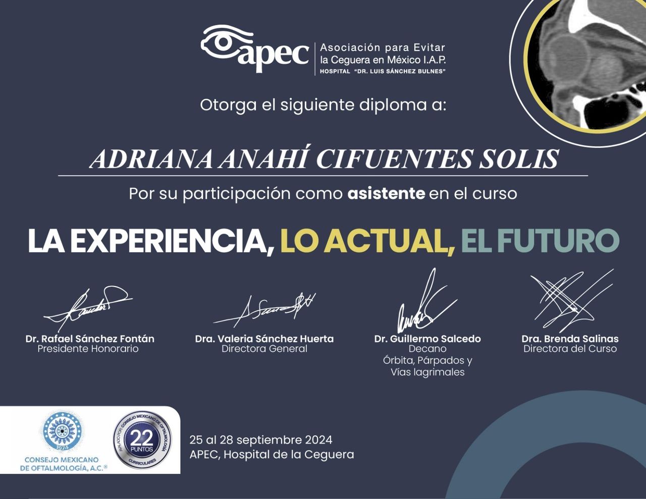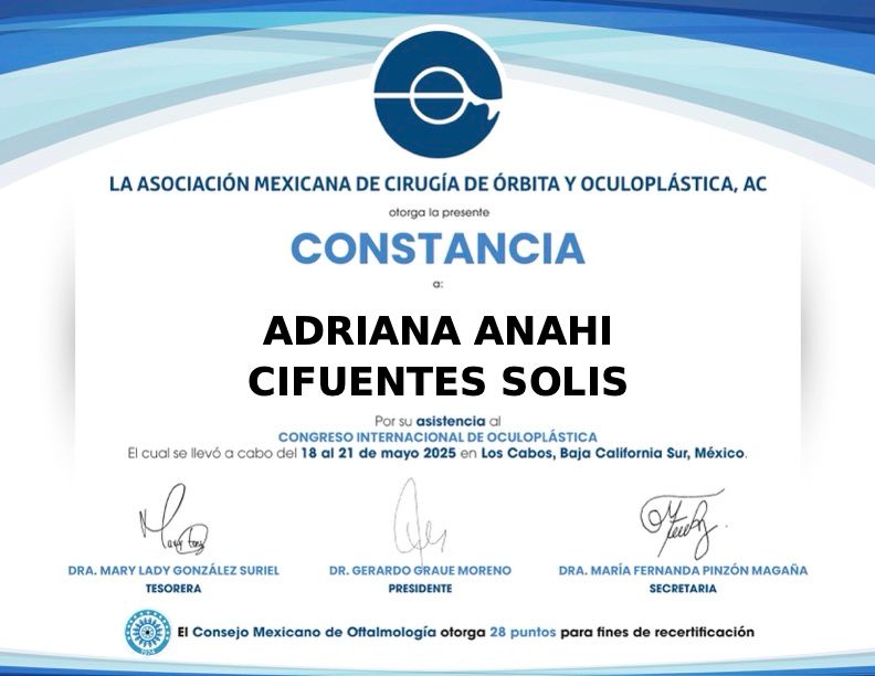 Soy Adriana Cifuentes, oftalmóloga oculoplástica en Tuxtla Gutiérrez. En mi consulta atiendo a adultos y niños de cualquier edad que presenten problemas de visión, malestar ocular o inconformidad en el aspecto de tus párpados. Cuento con la alta especialidad en cirugía de órbita, párpados y vía lagrimal, siempre en búsqueda de actualización, mejoría académica y tecnológica constante, con el fin de ayudarte de forma más especializada.