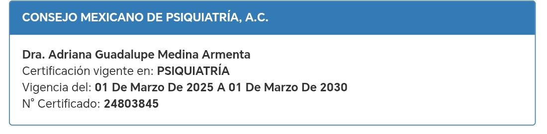 ¡Hola! Soy Adriana Medina, psiquiatra por vocación y de corazón. Me formé en la Universidad Autónoma de Sinaloa y estoy certificada por el Colegio Mexicano de Psiquiatría. Elegí esta especialidad porque creo profundamente que la salud mental importa — y mucho. Acompañar a las personas en momentos difíciles, verlas reconectar con su bienestar y recuperar su paz, es lo que le da sentido a mi trabajo.