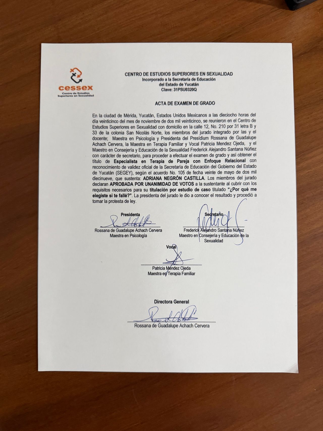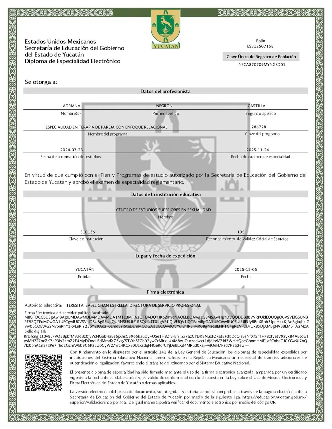 UADY, me formé en Terapia Gestalt por AYUPSIH y en Terapia de Pareja y Sexualidad en la Universidad Complutense de Madrid, así también cursé la Especialidad en Terapia de Pareja Relacional en el Centro de Estudios Superiores en Sexualidad en Mérida, Yucatán.