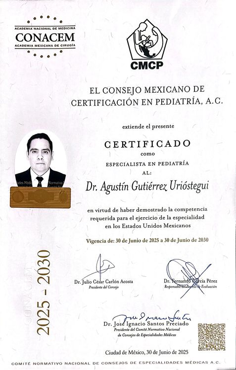 Estoy certificado por los Consejos Mexicanos de Pediatría y de Neonatología, y me encuentro en constante capacitación para mantenerme actualizado y poder brindarle la mejor atención a mis pacientes.