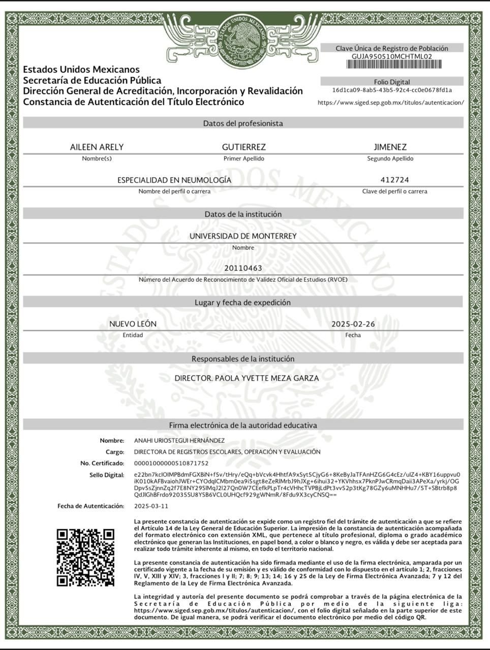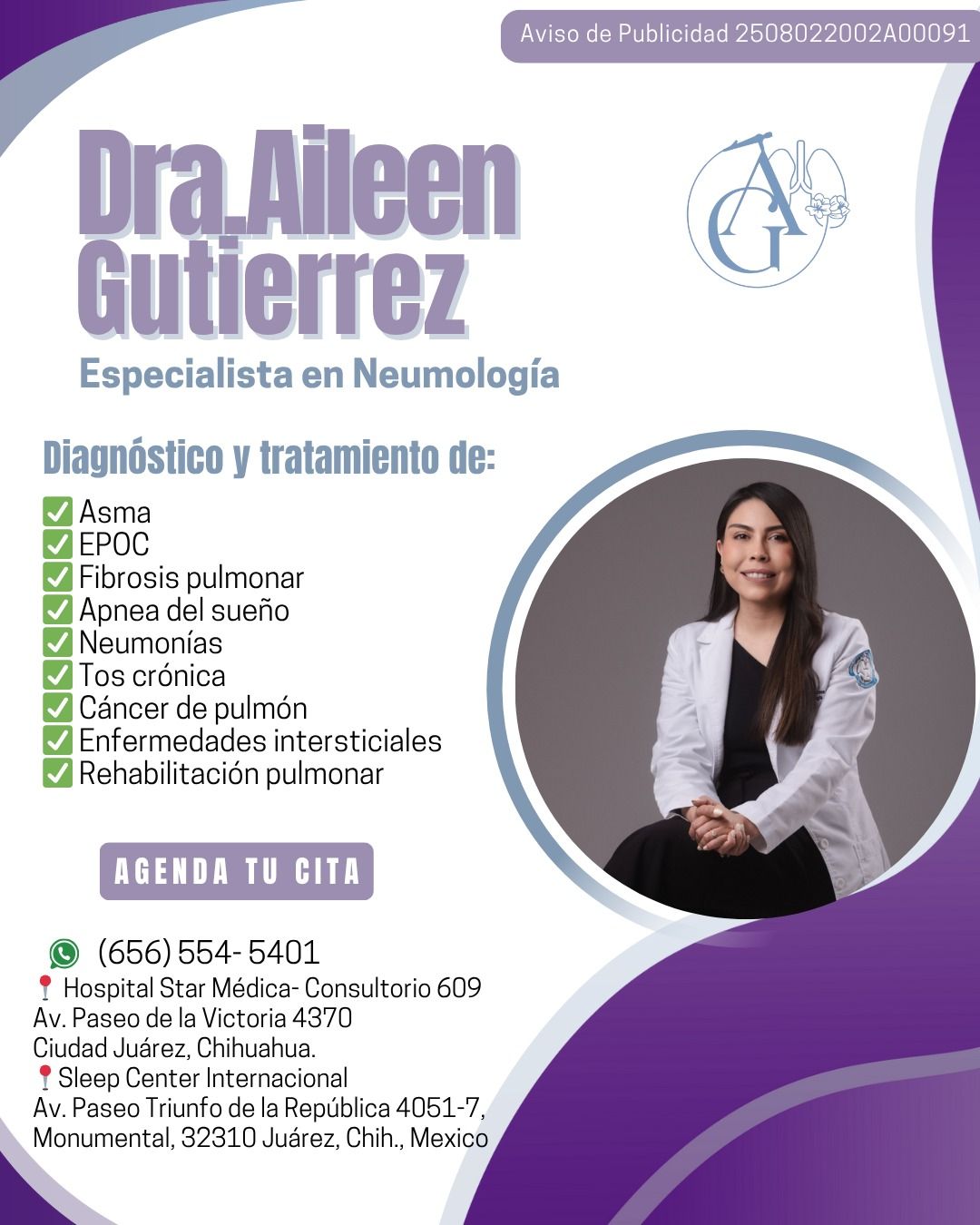 Soy médico cirujano egresada de la Universidad Autónoma de Ciudad Juárez, con especialidad en Neumología por la Universidad de Monterrey, realizada en la Unidad Médica de Alta Especialidad No. 34. Estoy certificada por el Consejo Nacional de Neumología.