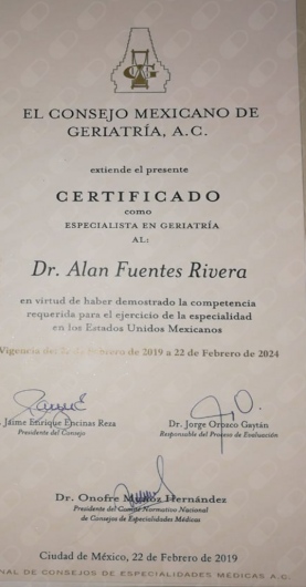 El doctor Alan Fuentes tienes 6 meses siendo el geriatra de mis papas los cuales han respondido muy bien al tratamiento del doctor y hemos visto un notorio cambio desde la primera consulta en la salud de mis padres, les estamos muy agradecidos al doctor
