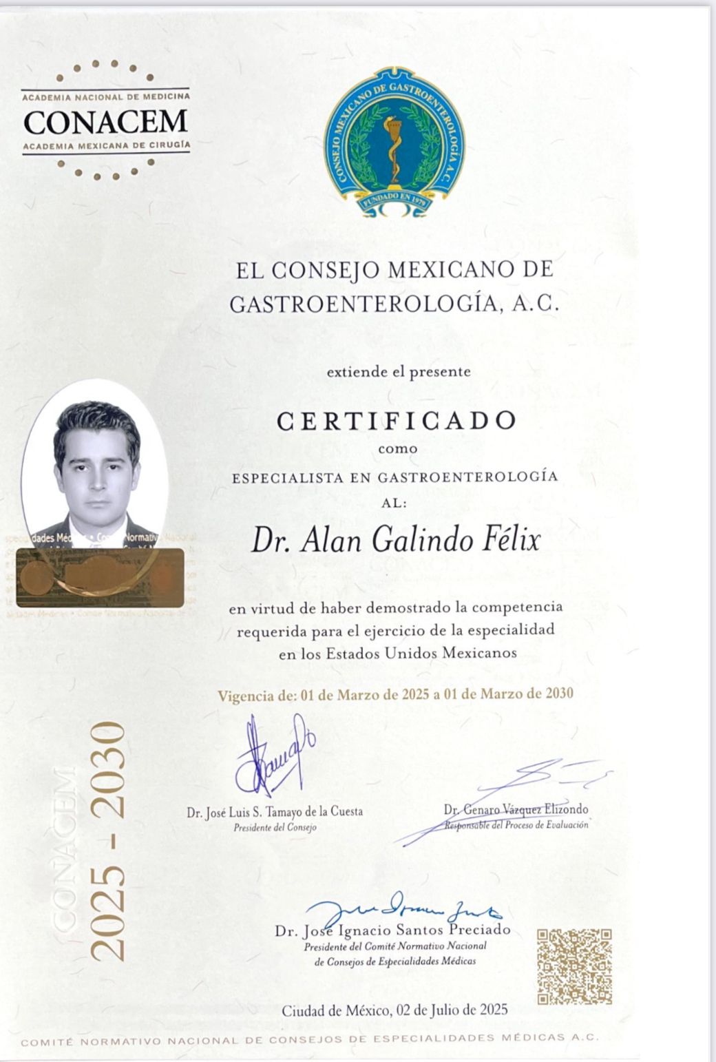 Soy el Dr. Alan Galindo, Gastroenterólogo certificado por el Consejo Mexicano de Gastroenterología. Especialista en el diagnóstico y tratamiento de enfermedades que afectan a: -Esófago -Estómago -Intestino delgado -Páncreas -Hígado -Vía Biliar -Colon