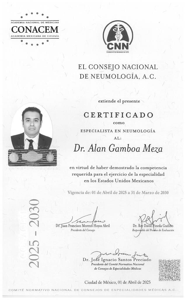 Soy el Dr. Alan Gamboa Meza, Neumólogo-Intensivista, egresado del Hospital Universitario de la Universidad Autónoma de Nuevo León.