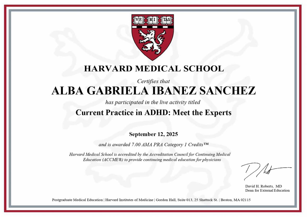 Tengo especial interés en el TDAH en adolescentes y adultos. Realicé entrenamiento en el centro especializado en TDAH en adultos en el Hospital Vall d’Hebron, en Barcelona España, y recientemente completé un curso de actualización en TDAH por la Universidad de Harvard.