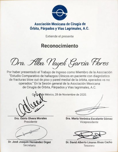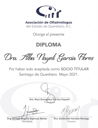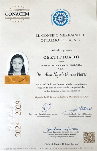 Realizó su formación de posgrado en el Instituto de Oftalmología Conde de Valenciana F.A.P., una de las instituciones con mayor prestigio en México, avalada por la Universidad Nacional Autónoma de México (UNAM). Como parte de su preparación asistió a cursos y congresos nacionales e internacionales, incluyendo una rotación médico-quirúrgica en el Hospital Italiano de Buenos Aires, Argentina.