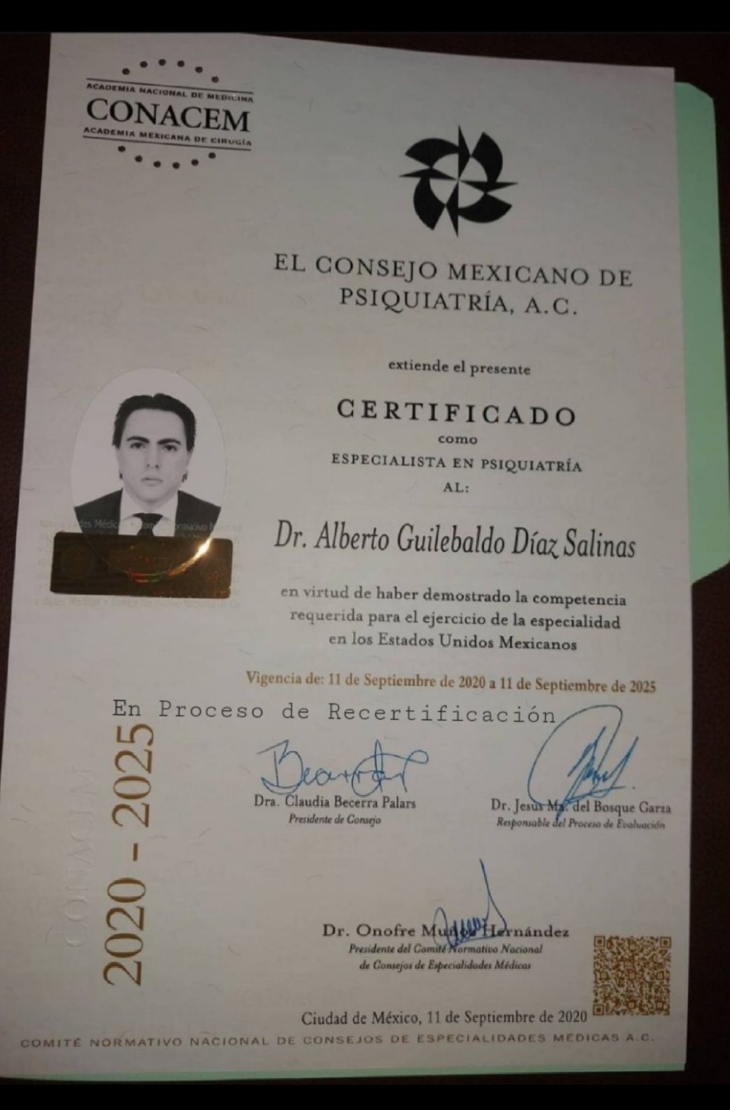 Todas las acreditaciones en Medicina, Psiquiatría, Consejo Nacional de Psiquiatría. Estudios en Psicología Deportiva del Entrenamiento, Psicoterapia Psicoanalítica, Dirección Técnica de Fútbol. Conjugo esta formación para individualizar tu plan de trabajo multidisciplinario.