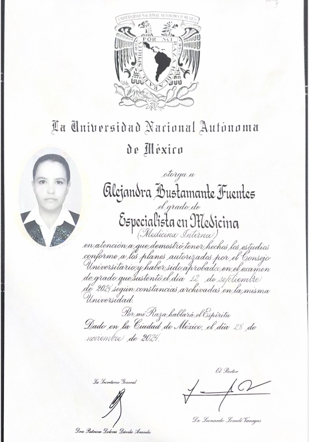 Soy la Dra. Alejandra Bustamante Fuentes, médico internista, mi enfoque principal es el diagnóstico integral y tratamiento de condiciones médicas del adulto, así como prevención de las mismas.
