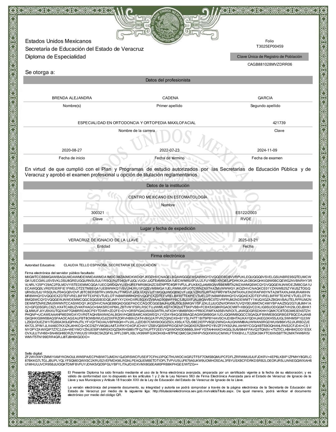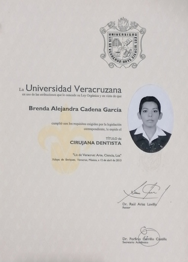 Cirujano Dentista por la universidad Veracruzana. Cédula 8100765.