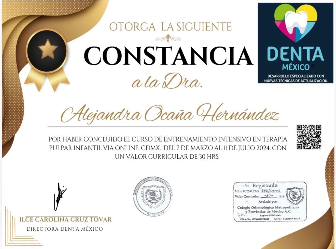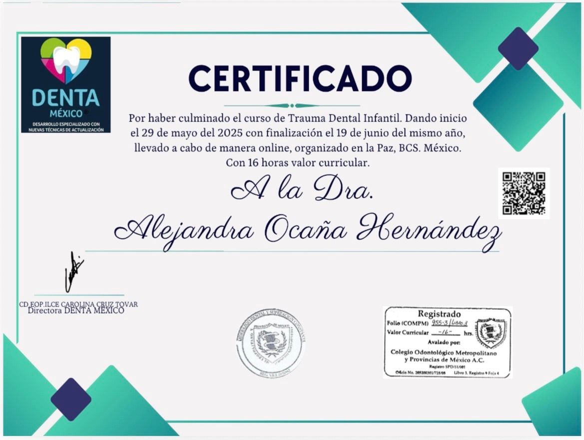 Excelente experiencia en odontopediatría. La Dra. Alejandra Ocaña Hernández fue muy profesional, paciente y empática durante toda la consulta. Desde el primer momento generó un ambiente de confianza, explicando cada procedimiento de forma clara y tranquila, lo que ayudó mucho a que el niño se sintiera seguro y sin miedo. Se nota su experiencia y vocación para trabajar con niños. Las instalaciones están limpias y bien equipadas, y la atención fue puntual. Sin duda la recomiendo ampliamente a otros padres que buscan una odontopediatra confiable y con un trato humano excepcional.