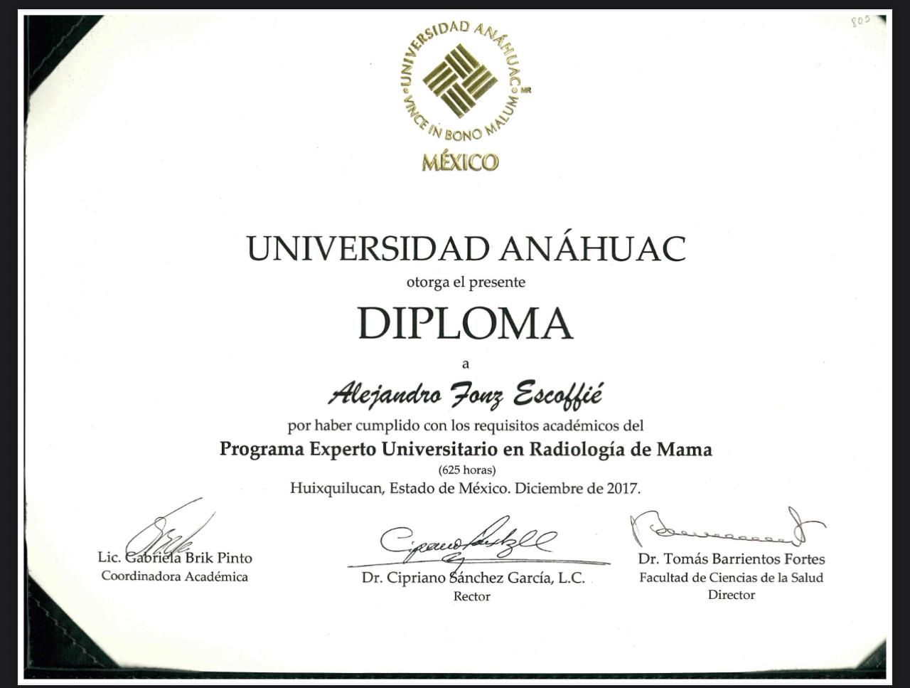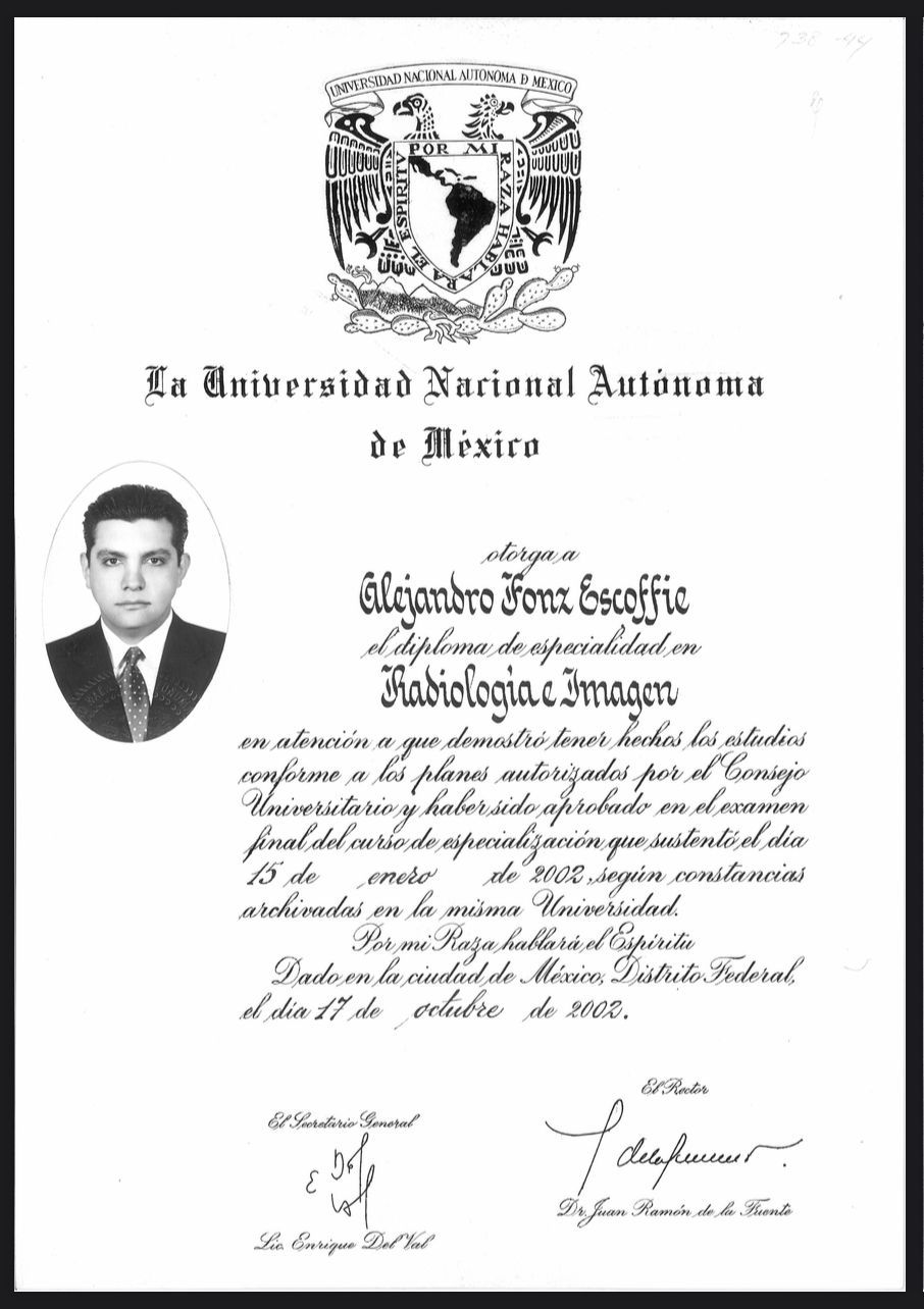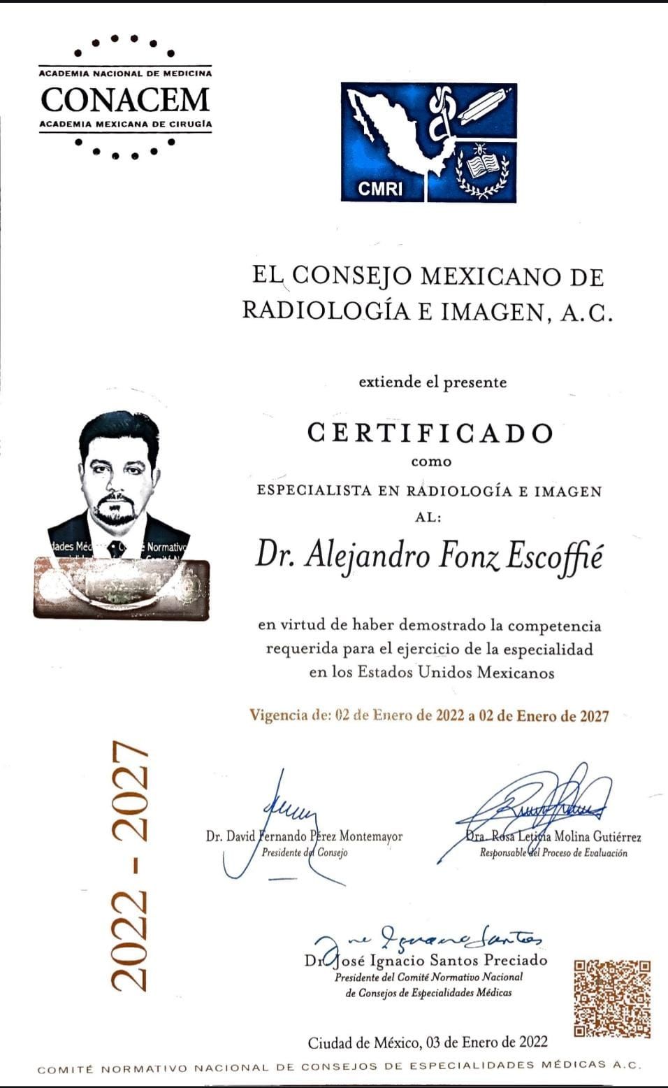 Médico radiólogo certificado con entrenamiento en radiología convencional, estudios de fluoroscopia, imagen seccional, procedimientos diagnósticos y terapéuticos de invasión mínima, imagen e intervencionismo de la glándula mamaria.