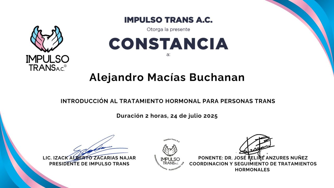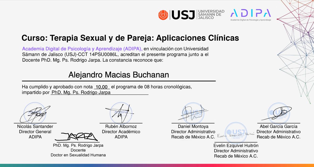 Soy Psicólogo por la Universidad Intercontinental, CDMX. Tengo una maestría en Psicoterapia Gestalt Integrativa, una especialidad en Sexología Educativa, y actualmente estudio la Maestría en Sexología Clínica por el Instituto Mexicano de Sexología.