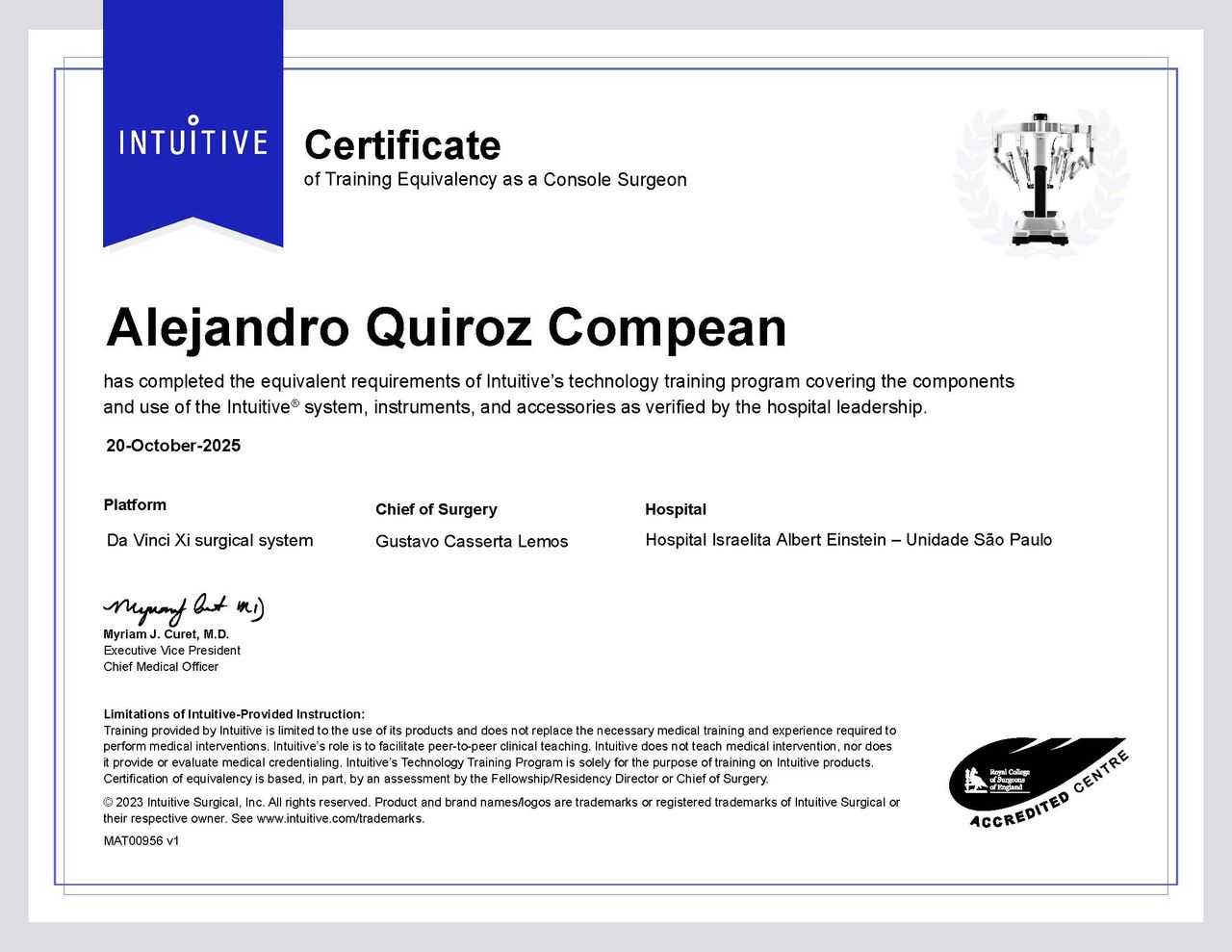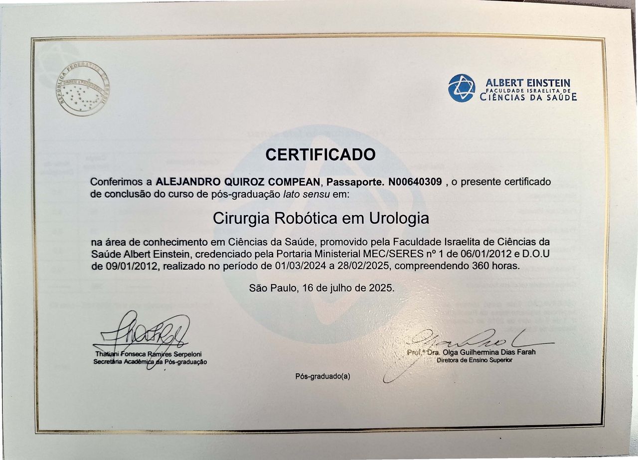 Realicé mi postgrado en cirugía robótica en el prestigioso Hospital Israelita Albert Einstein, en São Paulo, Brasil, uno de los centros más avanzados de Latinoamérica. Me especializo en el manejo de cáncer de próstata, riñón y vejiga, así como en cirugía laparoscópica y mínimamente invasiva.