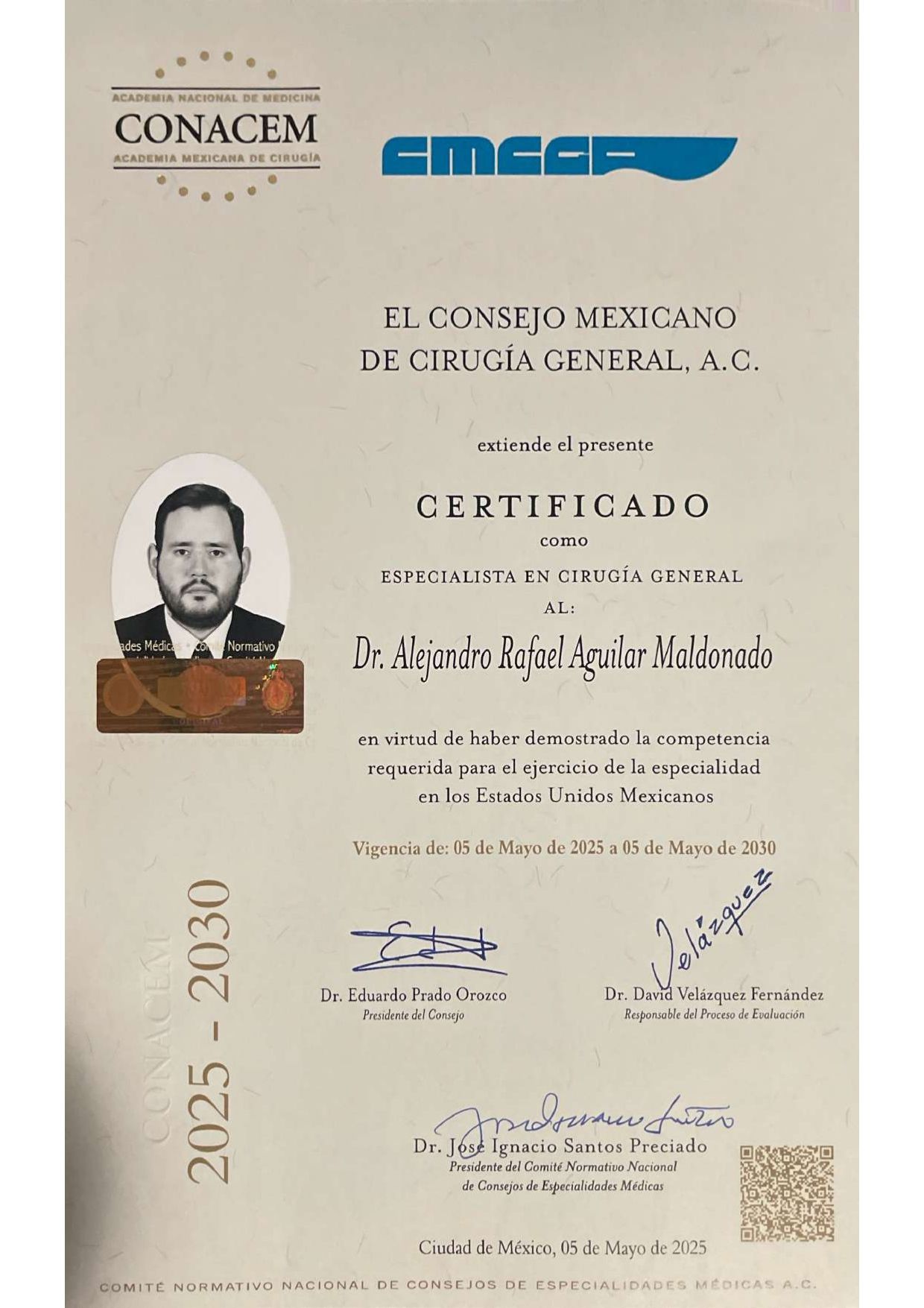 Soy Especialista Certificado por el Consejo Mexicano de Cirugía General A.C. C25024225
