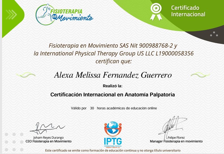 Soy Alexa Melissa Licenciada en fisioterapia, comprometida con la recuperación optima y funcional de los pacientes por medio de distintas técnicas, agentes físicos y el ejercicio terapéutico.