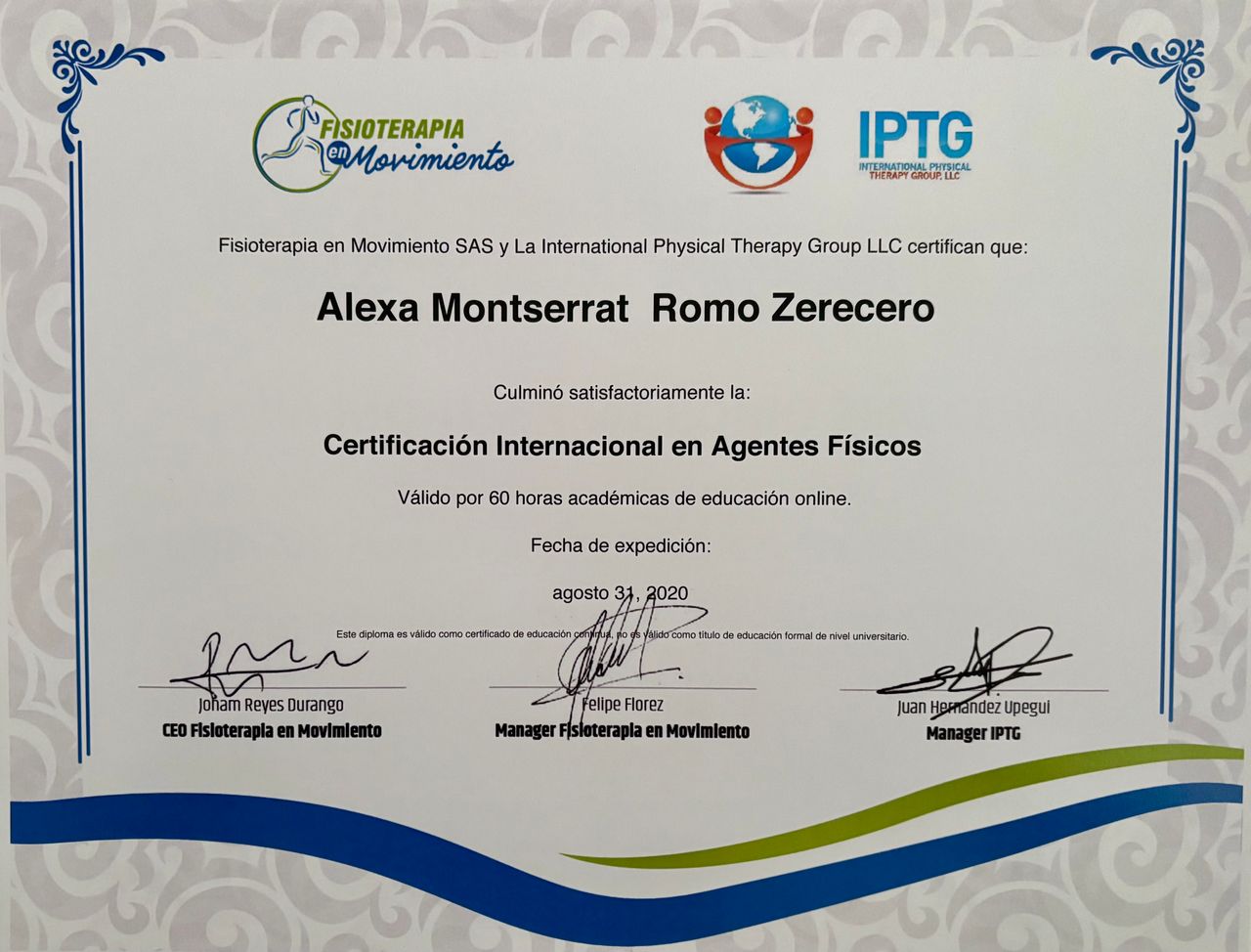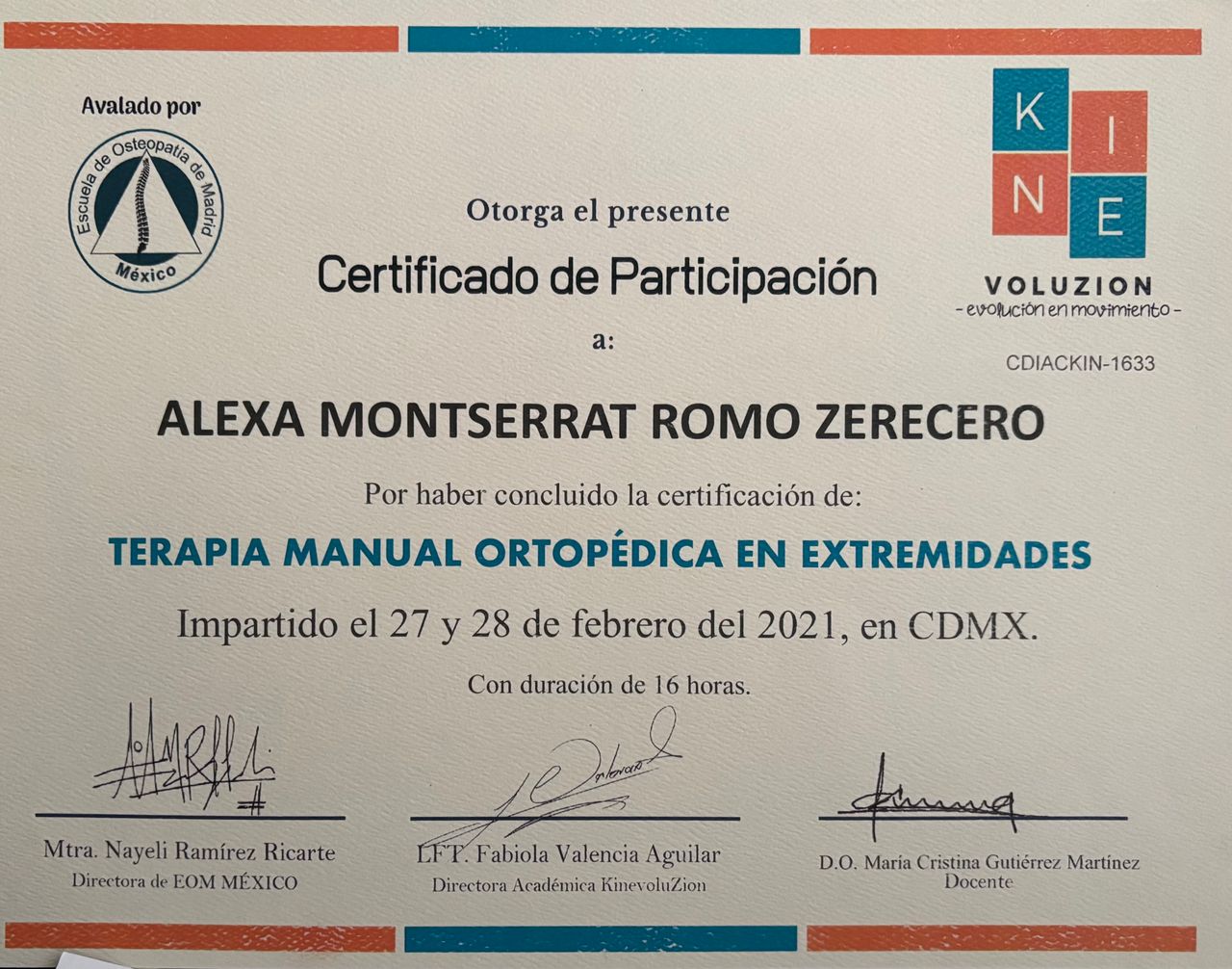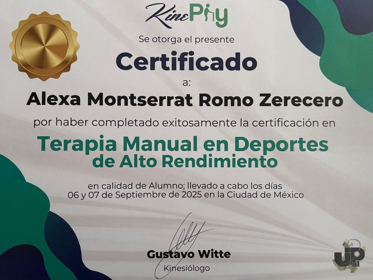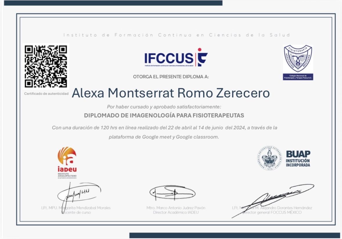 Soy Alexa M. Romo Zerecero, fisioterapeuta con formación en traumatología y ortopedia, con especial interés en la biomecánica del movimiento y el ejercicio terapéutico como herramientas clave para la recuperación. Trabajo principalmente con pacientes geriátricos, ortopédicos y postquirúrgicos, acompañándolos en su proceso de rehabilitación para que puedan recuperar su movilidad, fuerza y confianza en su cuerpo.