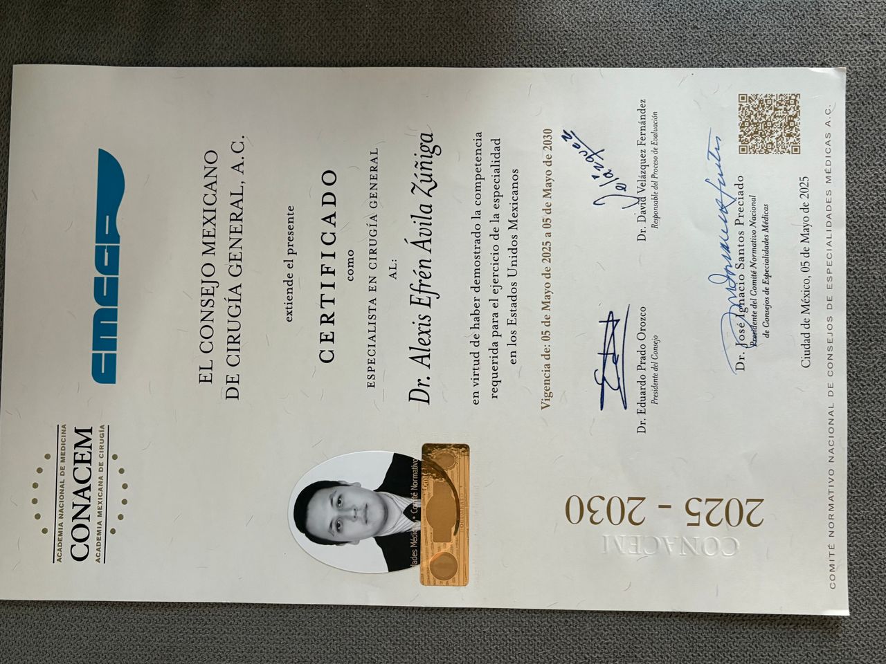 Hola soy el Dr. Alexis Efrén Ávila Zúñiga Cirujano General Certificado, especialista en atender padecimientos gastrointestinales y realizar cirugías relacionadas con padecimientos de la vesícula biliar, apéndice, intestino delgado, colon, Hernias de la pared abdominal,Hemorroides,manejo del pie diabético, y mucho más. Ofreciendo una atención humana con calidad y calidez , respaldado por un equipo multidisciplinario, será un placer atenderte.