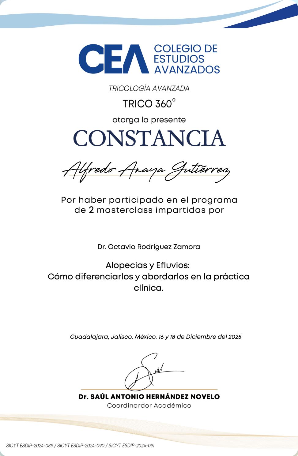 Cuento con estudios en la Universidad Autónoma de Guadalajara y especialización en la Universidad de Córdoba, España, así como diplomados en dermatología básica y avanzada. Mi enfoque combina la medicina estética capilar con procedimientos clínicos como injertos capilares, plasma rico en plaquetas, exosomas y terapias complementarias, siempre adaptadas a las necesidades específicas de cada persona.