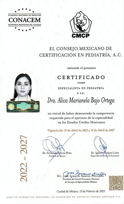 Certifiada por el Consejo Mexicano de Pediatría y Neonatología