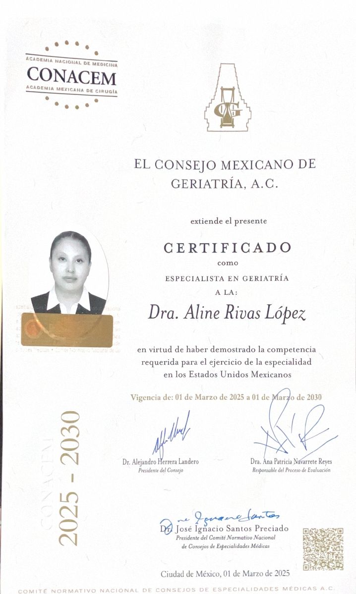 Hola, soy la Dra. Aline Rivas, soy médico geriatra con 15 años de experiencia en la atención integral del paciente, teniendo valores de respeto, puntualidad, empatía.
