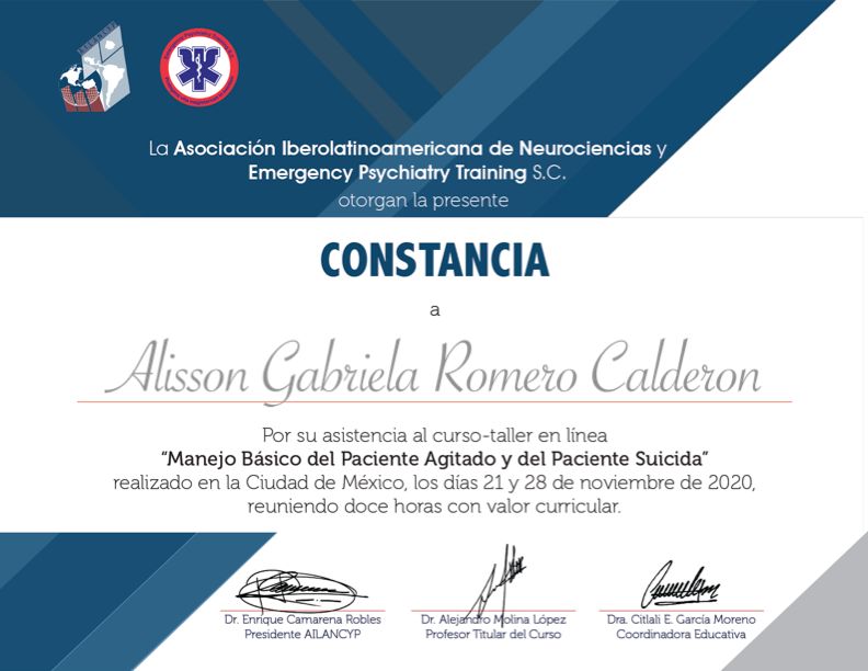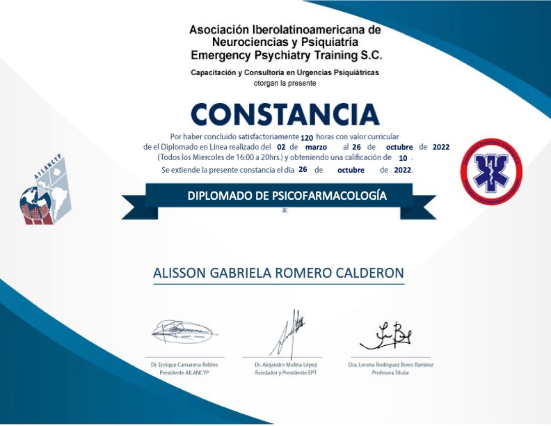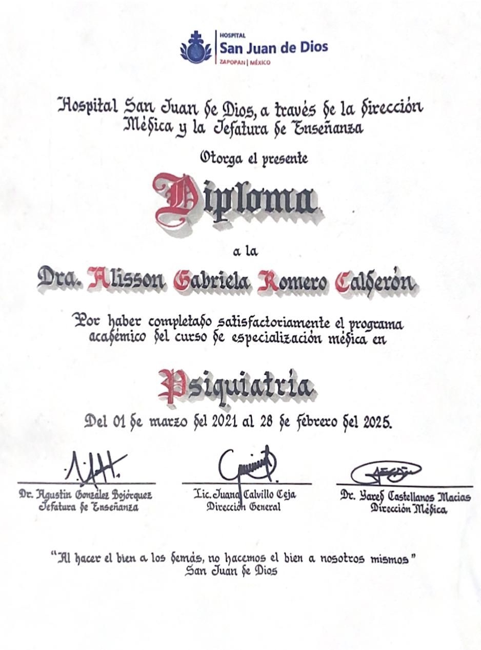 Soy la Dra. Alisson Romero, especialista en Psiquiatría, egresada del Hospital Psiquiátrico San Juan de Dios, uno de los hospitales más importantes del occidente de México en la formación de médicos especialistas en psiquiatría y en los campos afines a la salud mental.