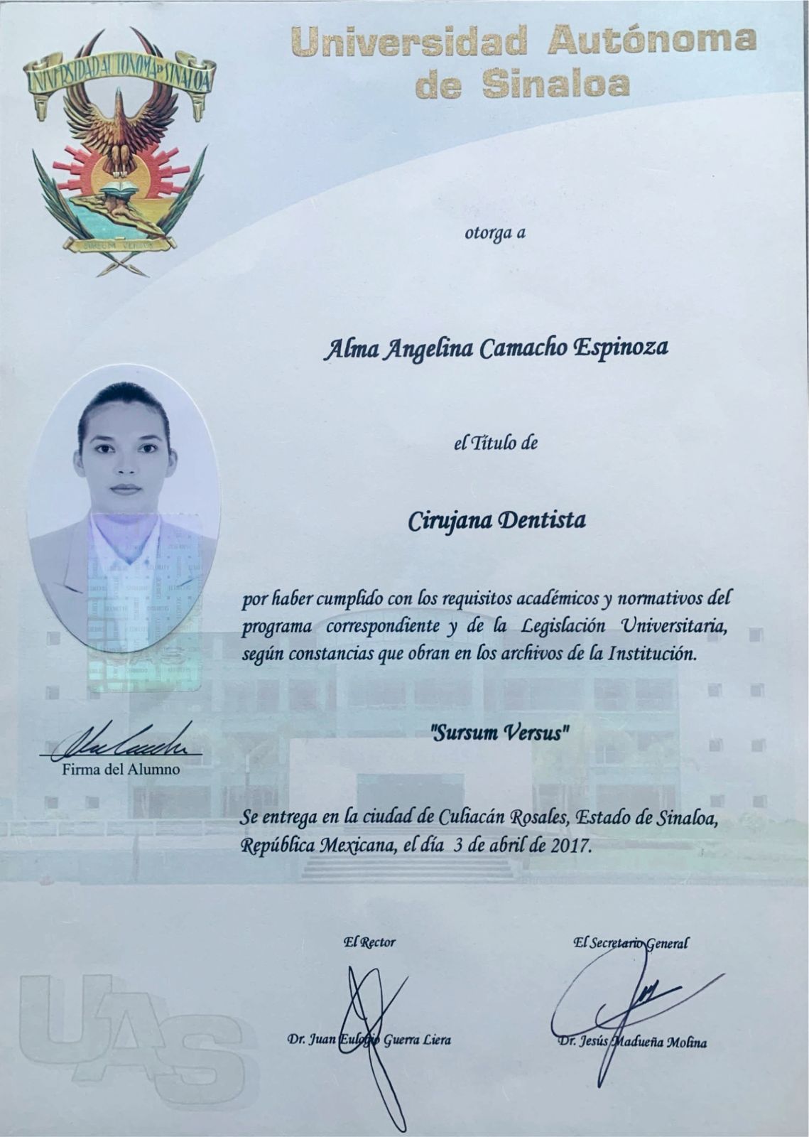 Soy la Dra. Alma Angelina Camacho Espinoza, cirujana dentista especialista en ortodoncia, comprometida con la salud bucal y la estética de la sonrisa de mis pacientes.