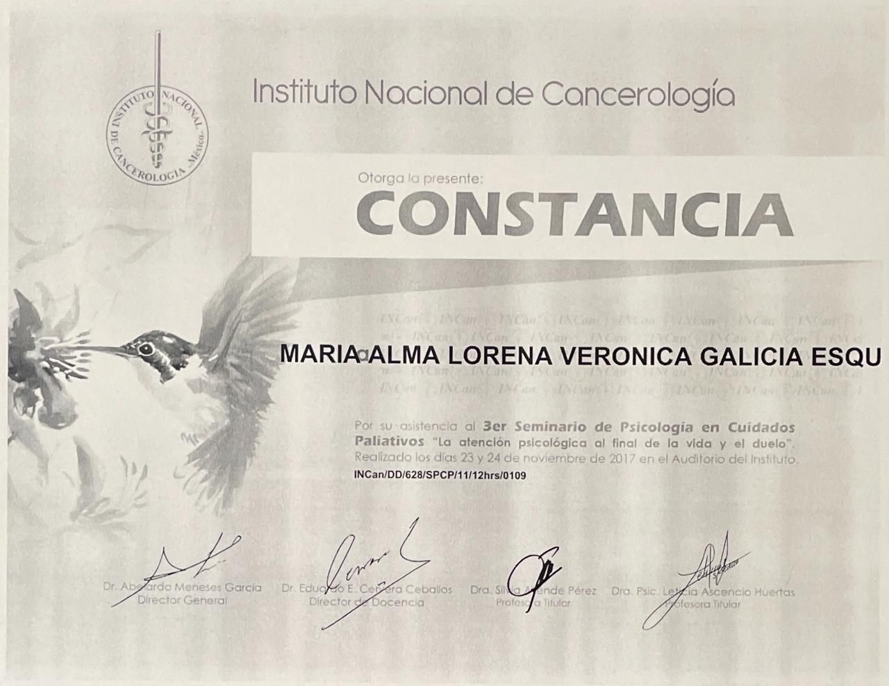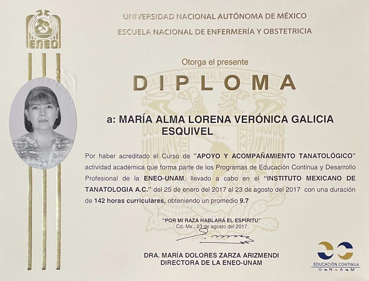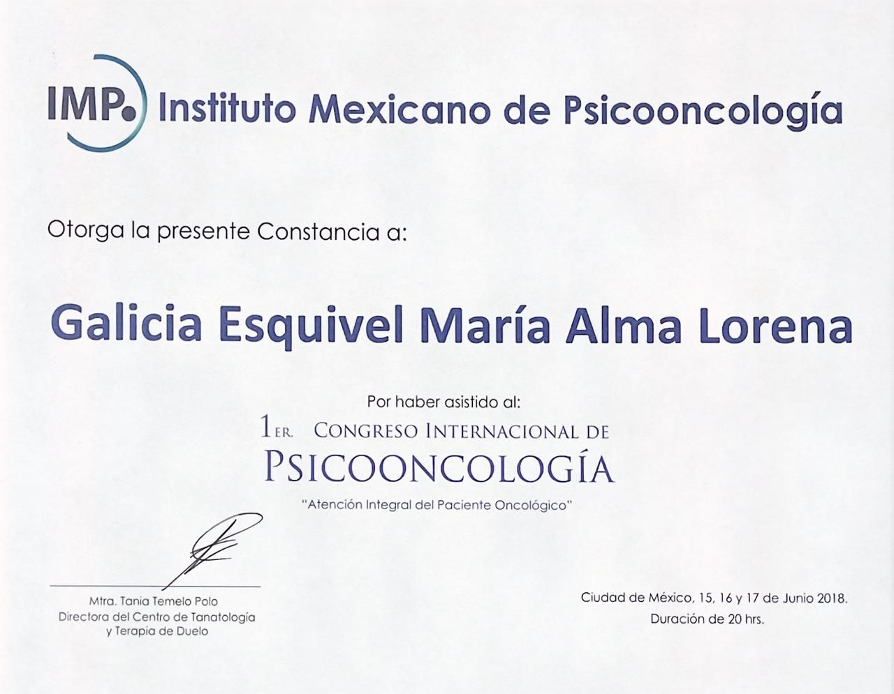 Soy licenciada en psicología clínica, egresada de la Universidad Latinoamericana, con Maestría en Psicooncología, egresada del Instituto Mexicano de Psicooncología, cuento con un Diplomado en Tanatología, otorgado por el Instituto Mexicano de Tanatología, asimismo, he tomado diversos cursos impartidos por importantes instituciones de salud.