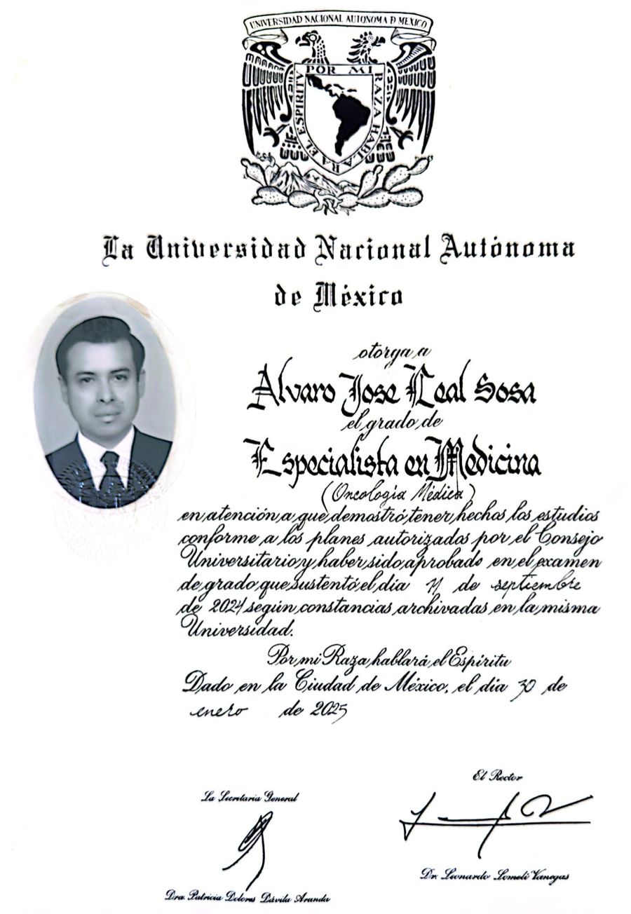-Oncólogo Médico formado en el Hospital de Oncología Centro Médico Nacional Siglo XXI de la Ciudad de México avalado por la UNAM. Cédula de especialidad 15110003