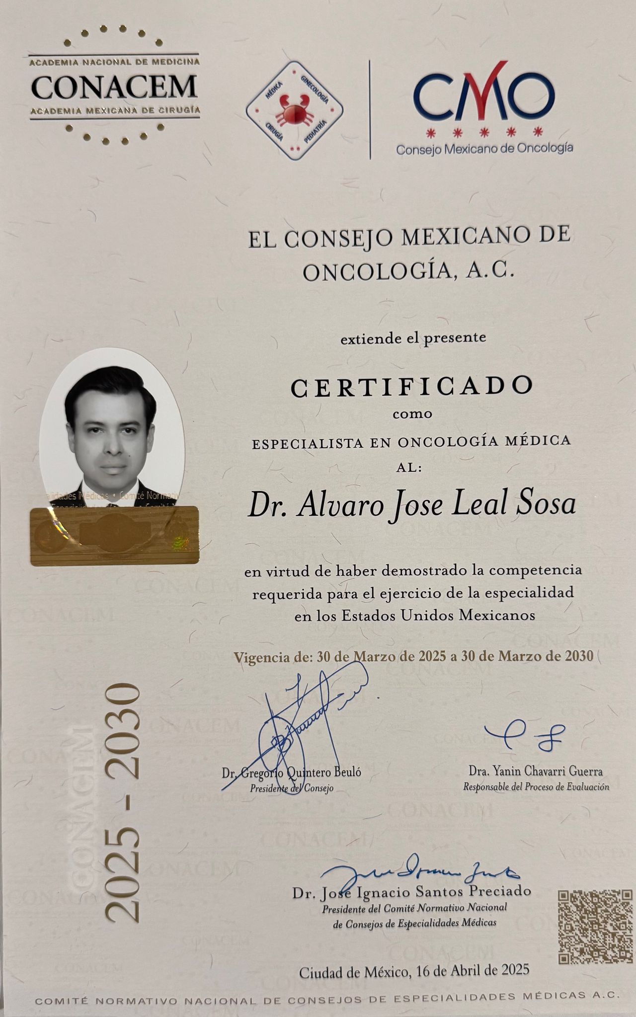 Soy oncólogo médico certificado por el Consejo Mexicano de Oncología (No. Registro 2919) y Miembro de la Sociedad Mexicana de Oncología