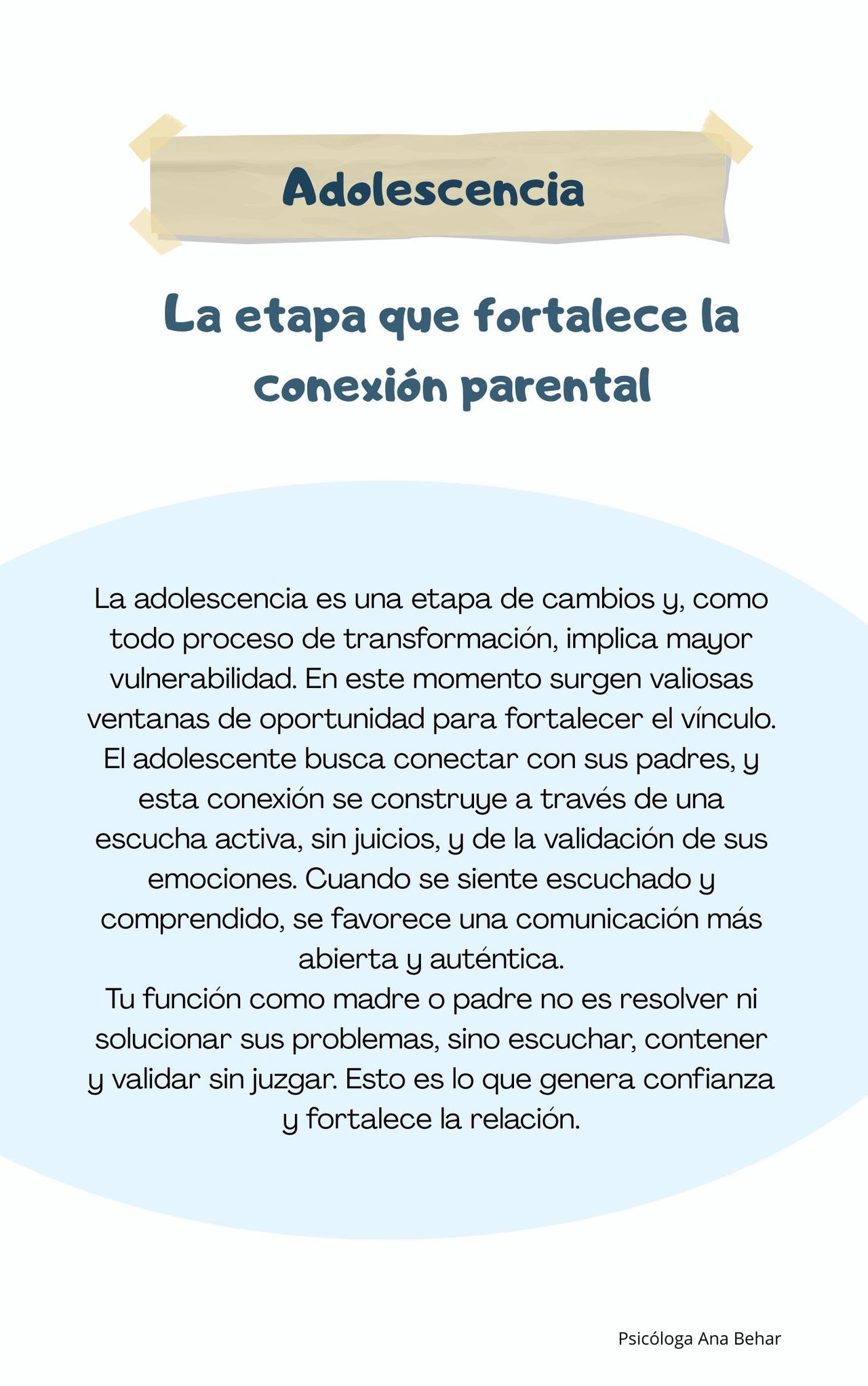 Llegué a terapia con muchas dificultades para comunicarme con mi hijo adolescente y con una sensación constante de distancia entre nosotros. Gracias al acompañamiento Ana he aprendido a escuchar mejor, a expresarme sin confrontación y a comprender mucho más a mi hijo. Nuestra comunicación ha mejorado notablemente y hoy siento más cercanía y confianza en nuestra relación. Me sentí siempre acompañada, comprendida y sin juicios. La recomiendo ampliamente para quienes estén atravesando retos en la crianza de adolescentes