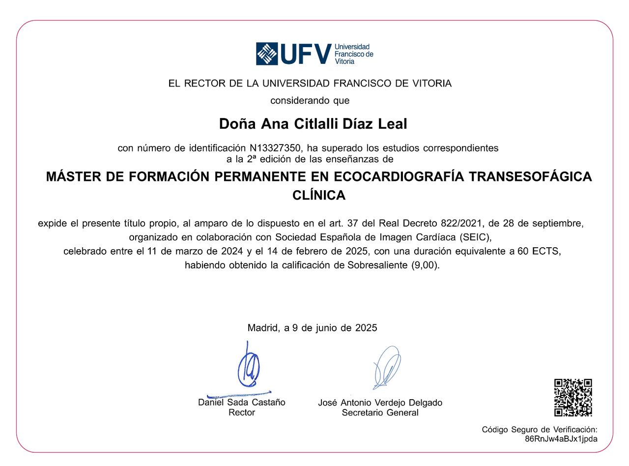 Soy Cardióloga certificada por el Consejo Mexicano de Cardiología. Cuento con Alta Especialidad en Ecocardiografía de Adultos por la Universidad Autónoma de Guadalajara, así como dos Máster en Ecocardiografía Clínica Avanzada y Ecocardiografía Transesofágica por la Universidad Francisco de Vitoria, donde obtuve matrícula de honor.