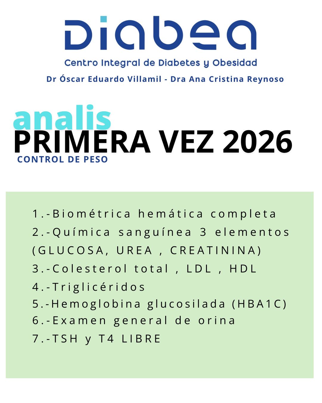 Para aprovechar mejor tu consulta, te comparto en la imagen los laboratorios necesarios para valoración inicial.