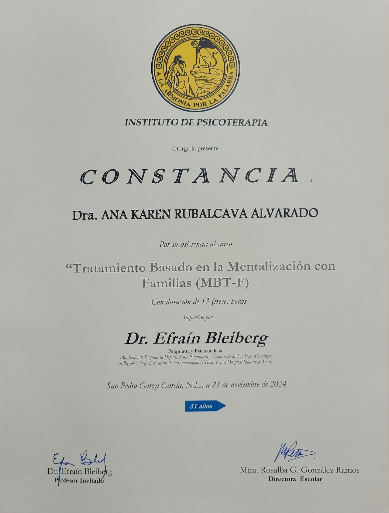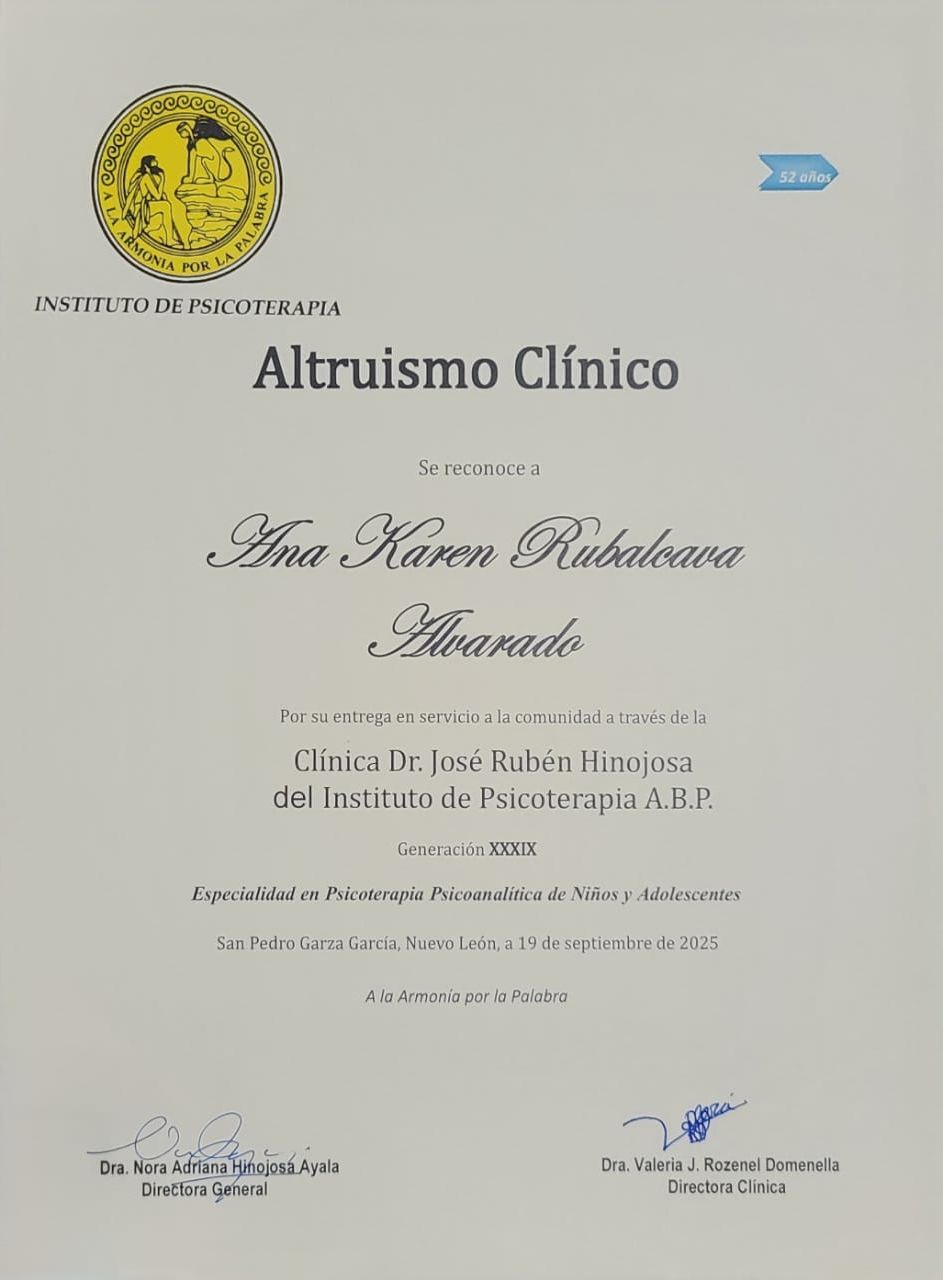 Soy Médico Cirujano y Partero, egresada de la Facultad de Medicina, de la Universidad Autónoma de Nuevo León. Cuento con una formación en posgrado como Psicoterapeuta Psicoanalítica de Adultos y una Especialidad como Psicoterapeuta Psicoanalítica de Niños y Adolescentes.