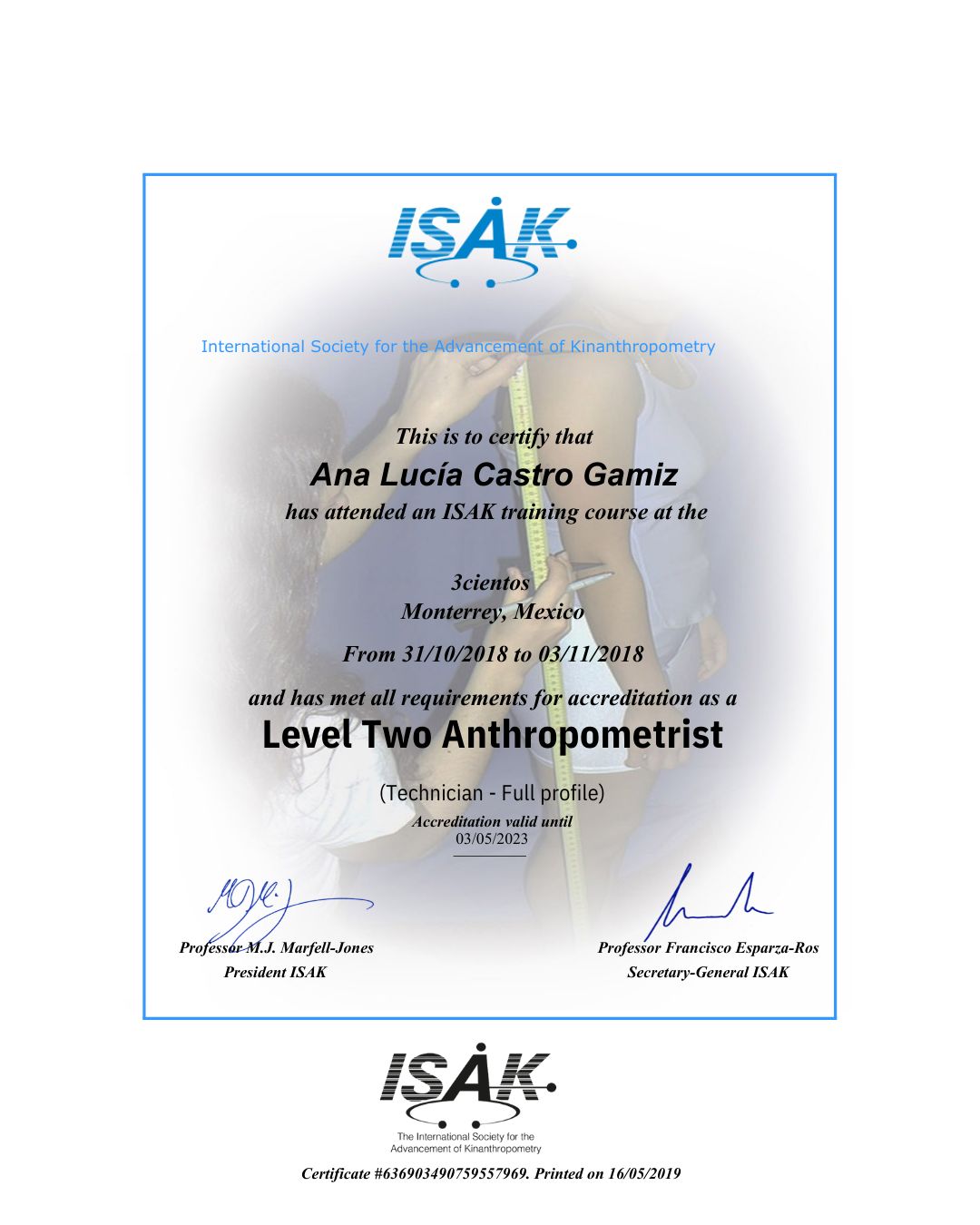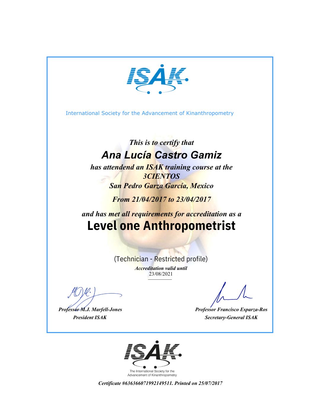 Certificada en antropometría ISAK nivel 1 y 2.