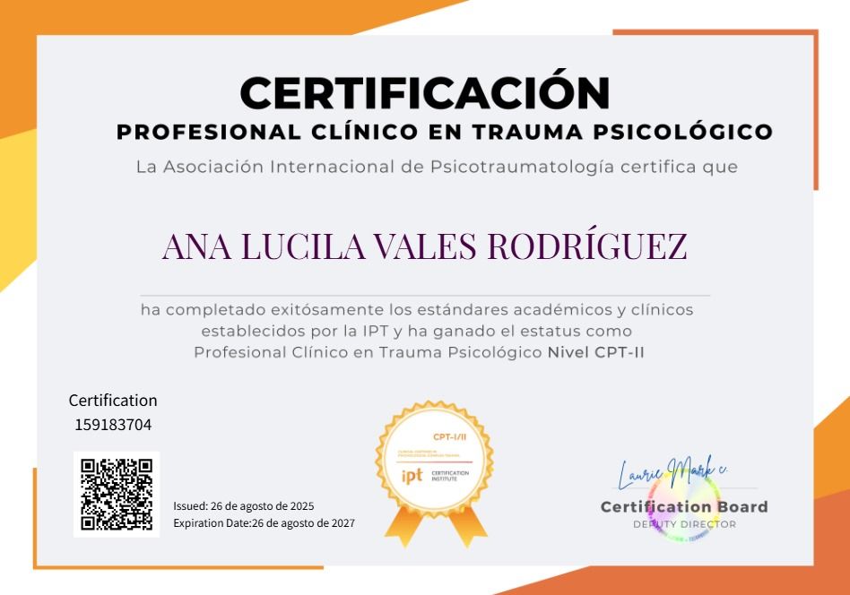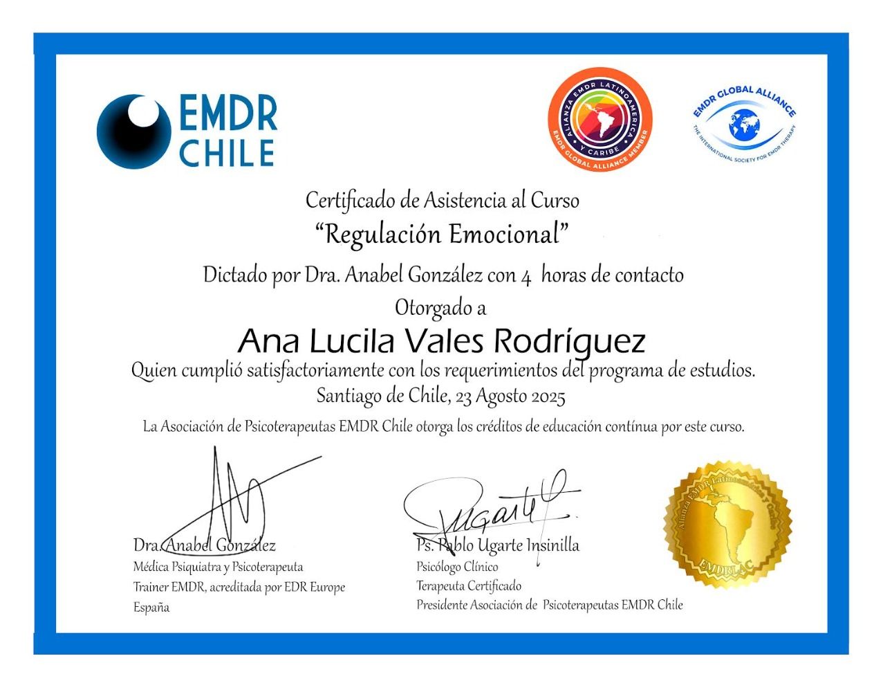 Cuento con una certificación internacional por el EMDR Institute y por la Alianza EMDR Latinoamérica y Caribe como terapeuta EMDR, terapia que hoy en día se considera el mejor tratamiento para los trastornos relacionados con cualquier tipo de trauma.