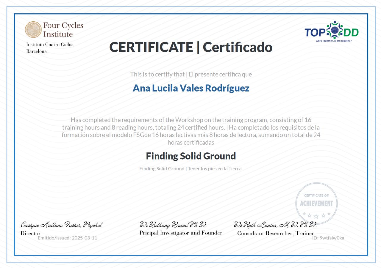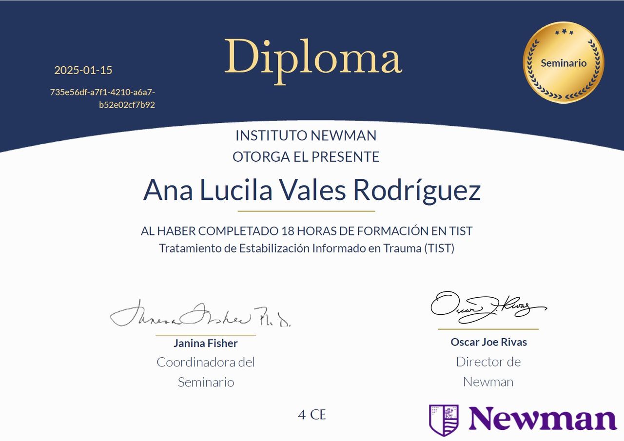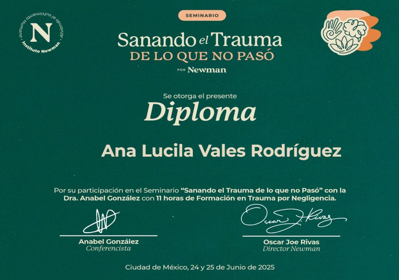 Tengo entrenamiento como terapeuta IFS (Sistemas de Familia Interna), por la Clínica Grialis by Newman (Córdoba, Argentina) la cual es una modalidad terapéutica basada en la evidencia, enfocada en sanar traumas. Certificada en Habilidades Clínicas para Síntomas Disociativos por la Asociación Mexicana de Psicotraumatología.