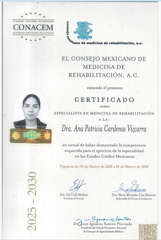 Soy especialista en Medicina de Rehabilitación con estudios de alta especialidad en Medicina de Electrodiagnóstico con 20 años de experiencia.