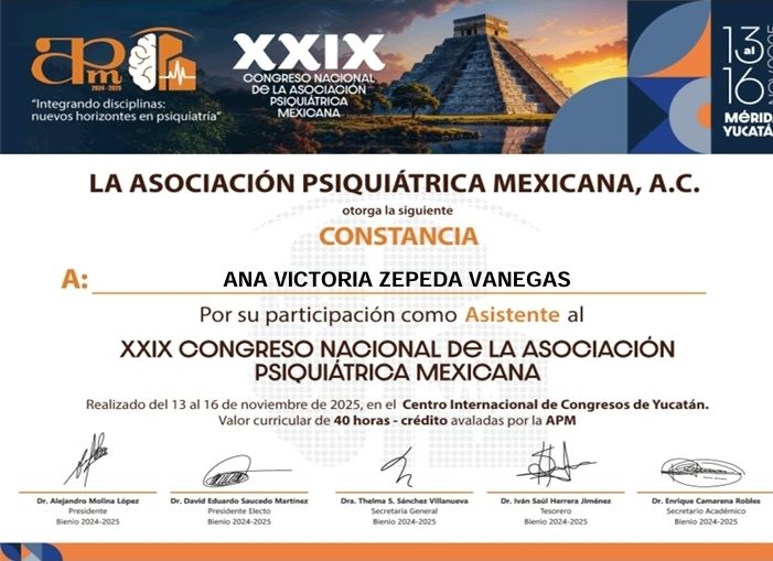 Egresada de la especialidad en Psiquiatría del Hospital Civil Fray Antonio Alcalde en el año 2010. Atención en consulta privada desde al año 2008. Médicos psiquiatra en el departamento de psiquiatría en el hospital del ISSSTE Zapopan en el 2011 y 2012 Médico adscrito a la Clínica de Trastornos afectivos del Hospital San Juan de Dios desde el 2012. Certificada por el Consejo Mexicano de Psiquiatría en mayo del 2014. Asistencia frecuencia a congresos de actualización médico psiquiátrica respecto a temas de ansiedad, depresión, insomnio y trastorno bipolar así como actualización en farmacología o tratamiento médico psiquiátrico. Actualmente cursando un título de experto universitario en el tratamiento de trastornos afectivos como depresión y trastorno bipolar modalidad en línea por la universidad de Alcalá en Madrid España. Diplomado en Tanatología 2023.