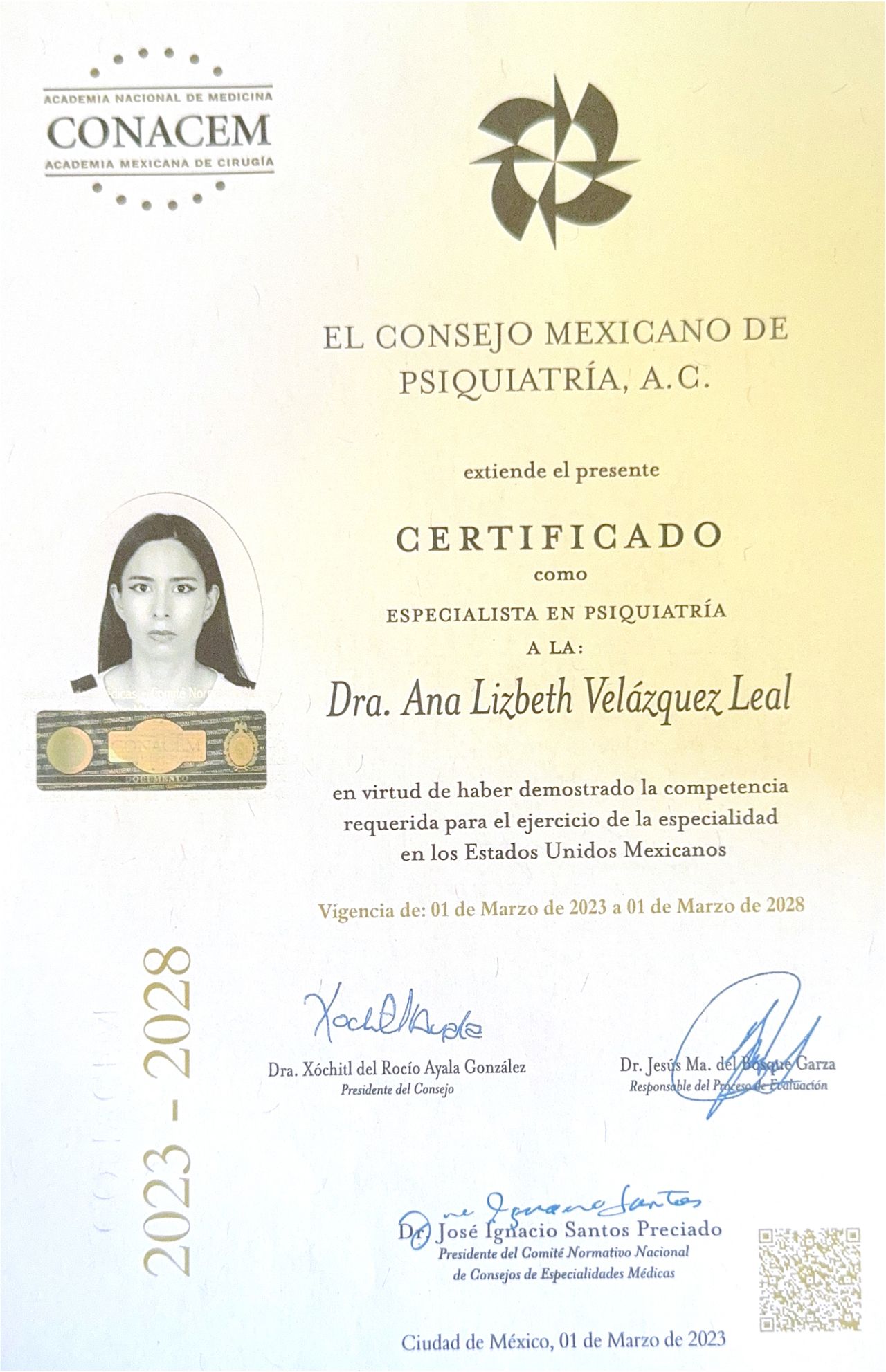 Soy la Dra Analiz Velázquez Leal, originaria de Guadalajara donde me formé como médico general, actualmente resido en Mérida, Yucatán donde me formé como psiquiatra de la UADY. Me apasiona lo relacionado a la biología del cerebro, emociones y comportamiento del ser humano. Mi mayor deseo es poder ayudar a las personas a comprender, empatizar, educar, y tratar la salud mental.