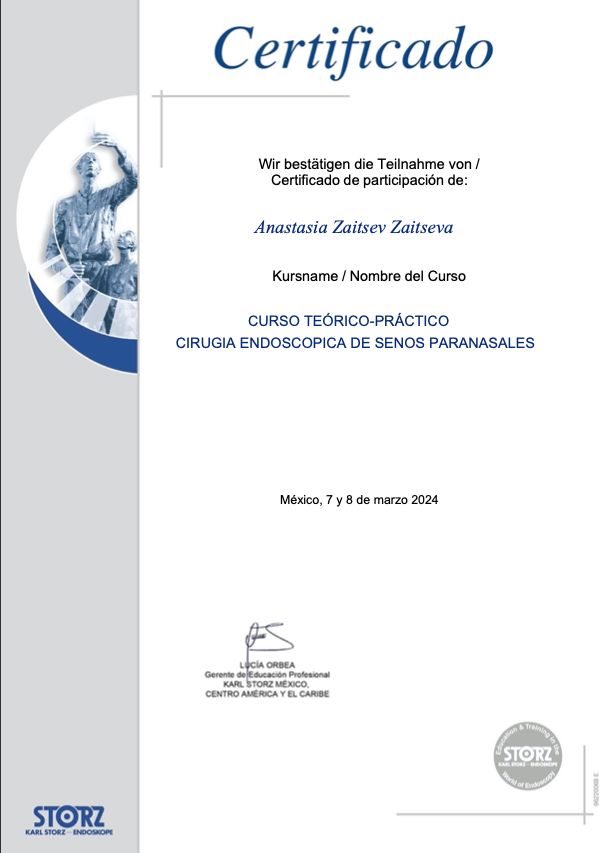Soy la Dra. Anastasia Zaitsev, especialista en Otorrinolaringología, egresada de la Universidad Nacional Autónoma de México (UNAM). Actualmente curso el Diplomado en Rinología y Cirugía Plástica Facial, lo que me permite brindar un manejo actualizado, integral y personalizado.